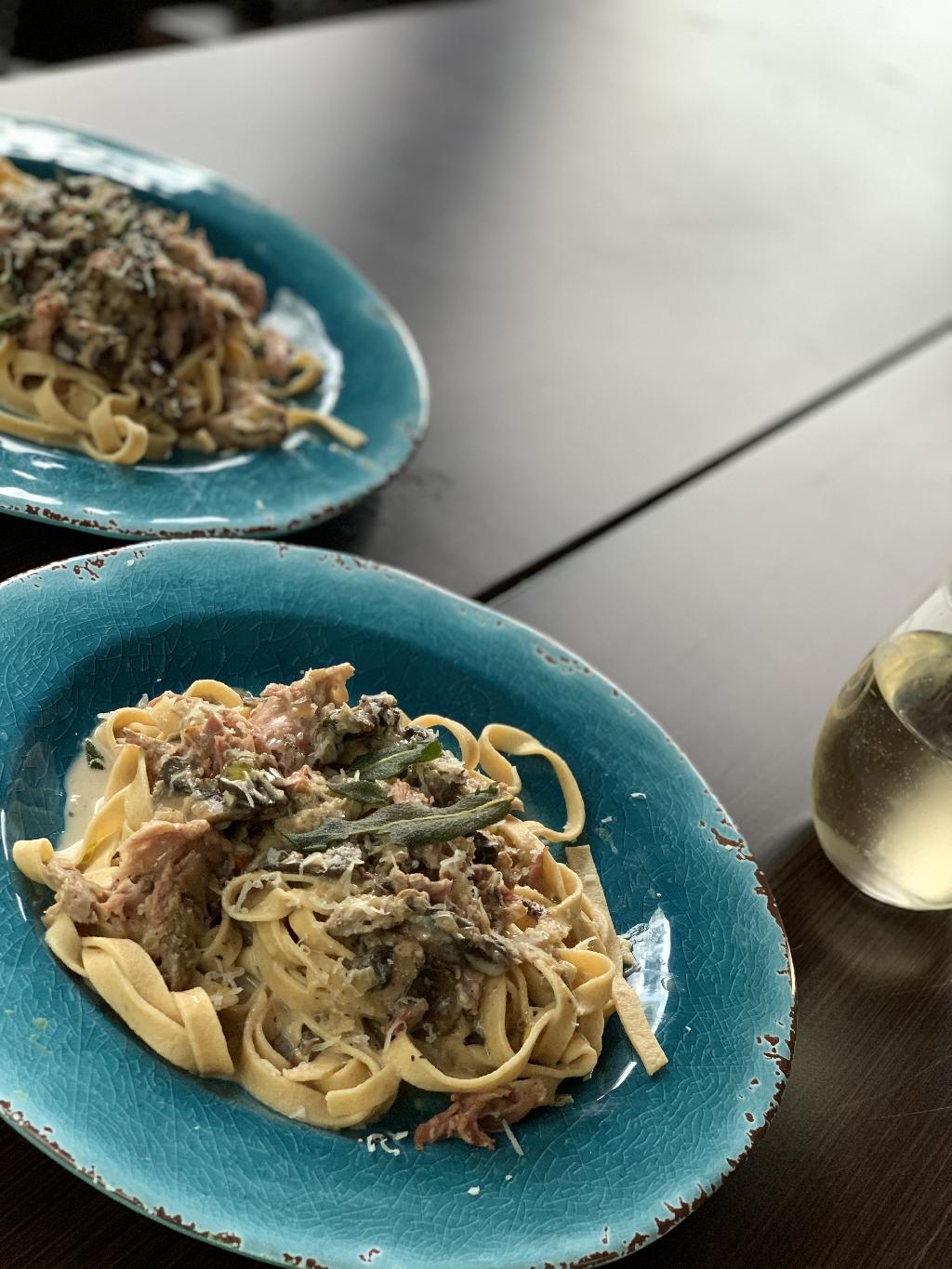 Step #13 Add to plate, cover with Quail Ragu, top with Parmigiano-Reggiano and Fried Sage Leaves.