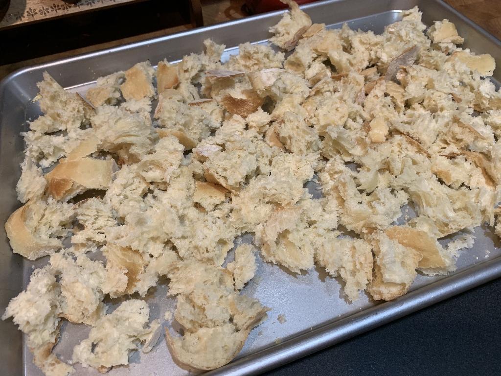 Step #5 Next start on your stuffing. Break up the Italian bread up into small piece and place on a baking sheet.