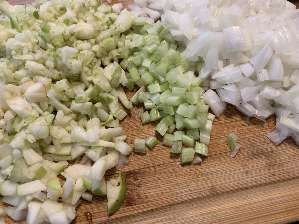 Step #7 While the bread is in the oven, dice Onion and Celery. Remove the core from the Apples and dice them up with the skin on.