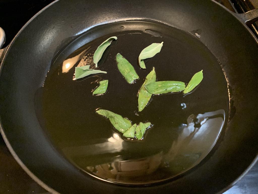 Step #8 It a large skillet. Add 3 tablespoons of Olive Oil and set heat on medium high. Add Sage leaves to the hot oil and cook until crisp. Remove to a plate covered with paper towels. We'll use this as a garnish to finish our dish.