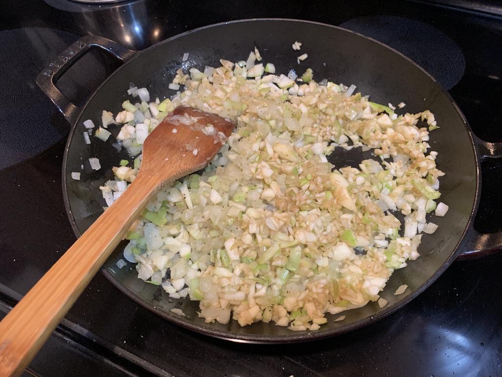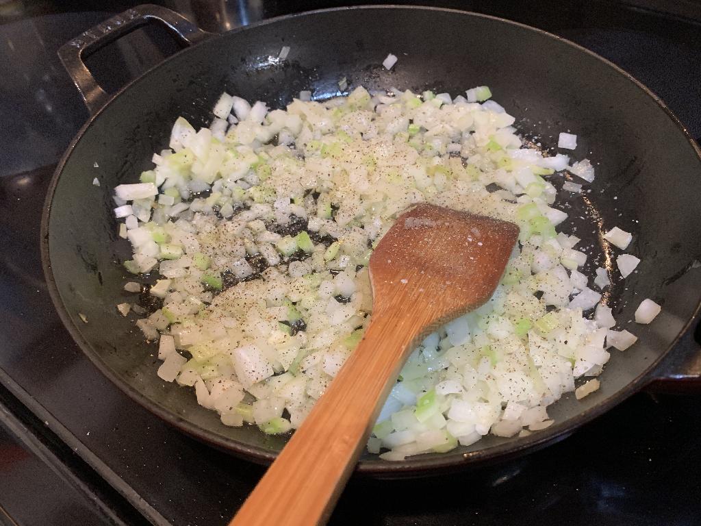 Step #9 Add diced up Onions and Celery to hot skillet. Sprinkle in salt and pepper. Let cook for 6 to 8 minutes.
