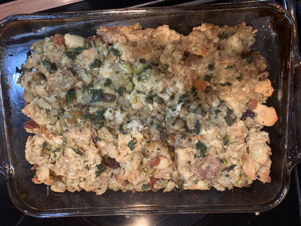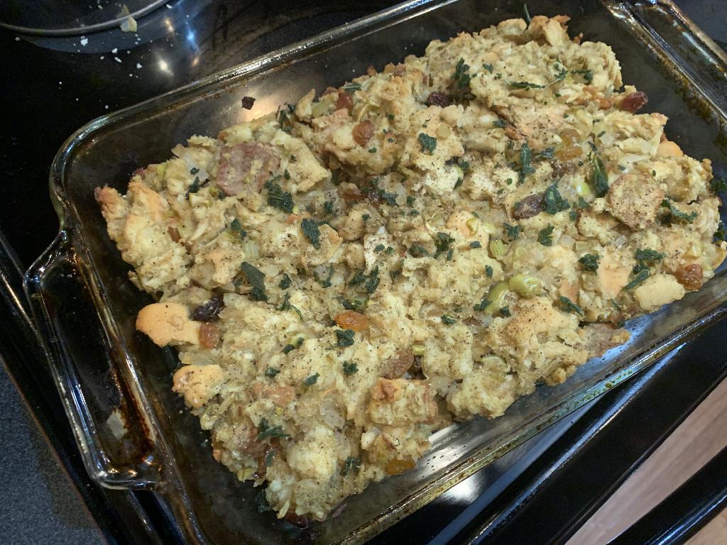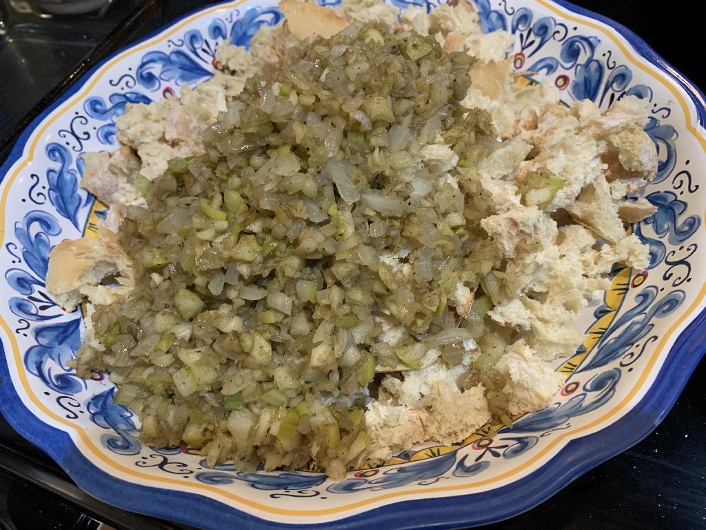 Step #11 Once the bread comes out of the oven, dump it into a large bowl that you'll use to combine all the ingredients. Add the cook Onions, Celery and Apples. Add Raisins, Salt and Pepper. Pour in Chicken Stock and incorporate all the ingredients with your hands.