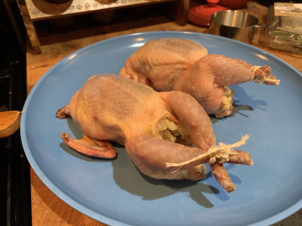 Step #18 Use the Apple stuffing to stuff your Quail. Use butchers' twine, tie the legs.