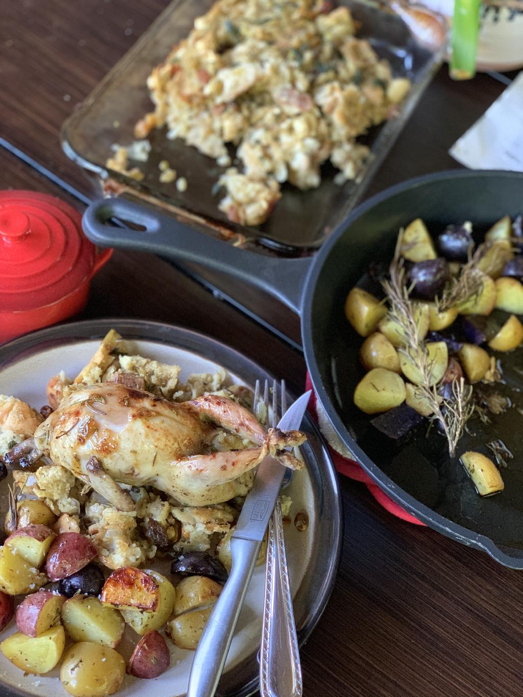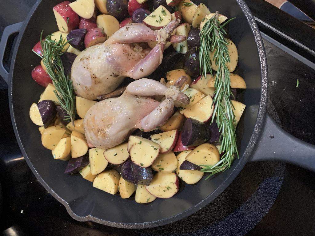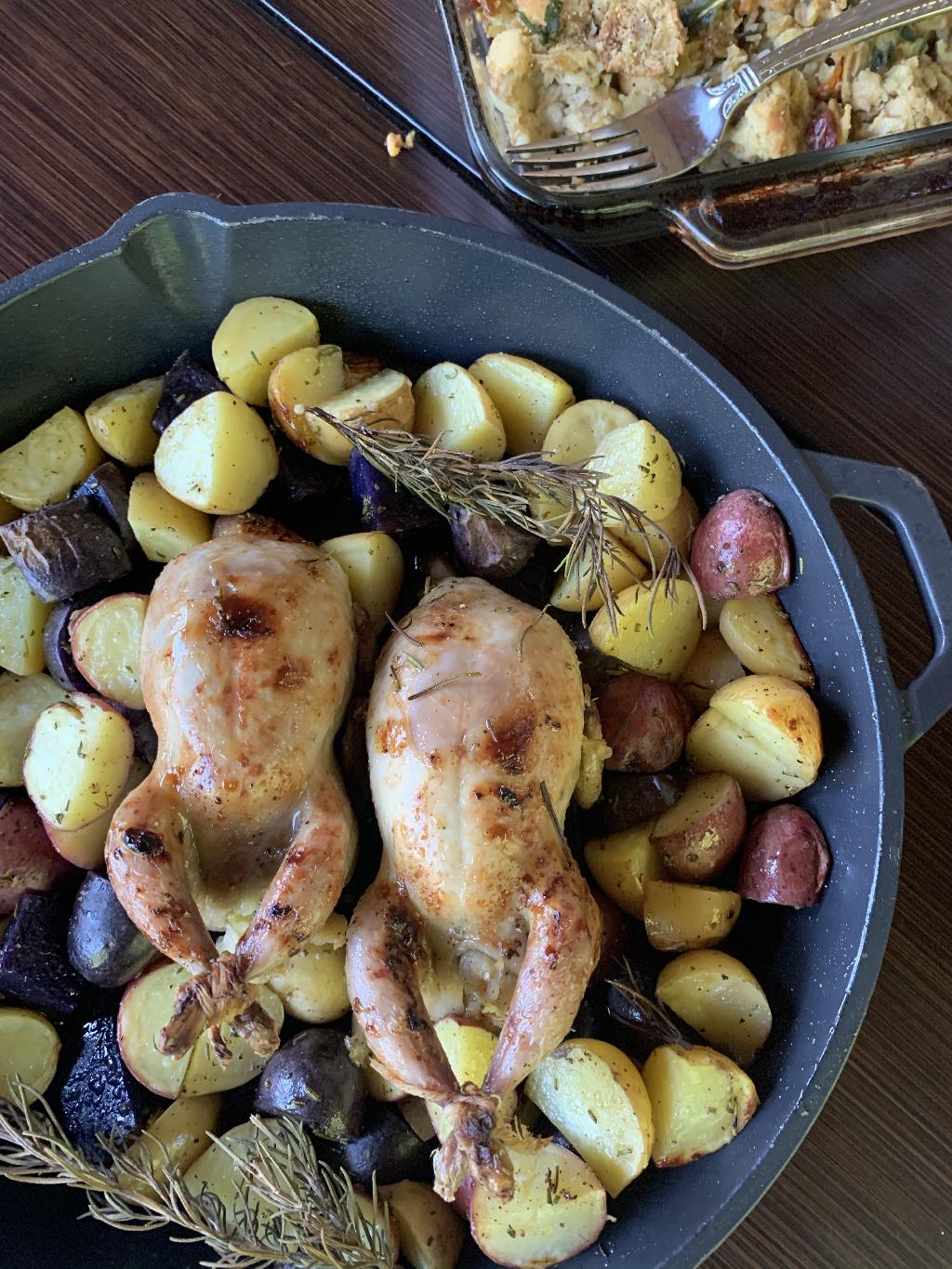 Cast Iron Quail with Apple Dressing and Rosemary Roasted Potatoes