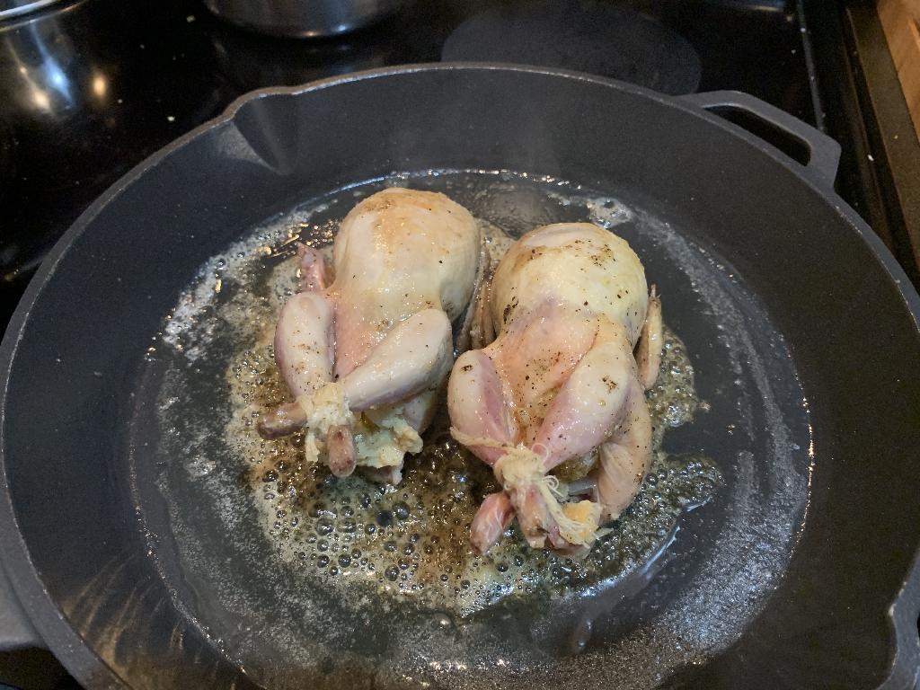 Step #22 Season the Quail generously with Salt and Pepper and place breast side down in hot skillet. Allow the breast meat to brown for a few minutes before flipping the birds over on their backs.
