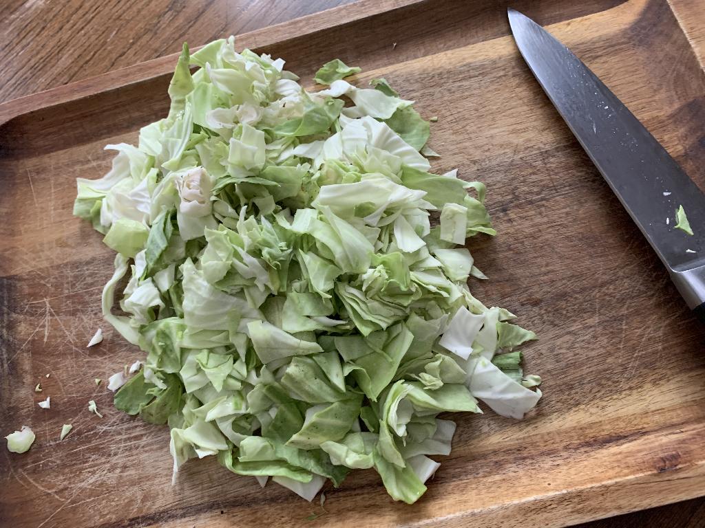Step #1 Remove the white core from the cabbage, leaving only the leaves. Shred or cut leaves with knife into fine pieces.