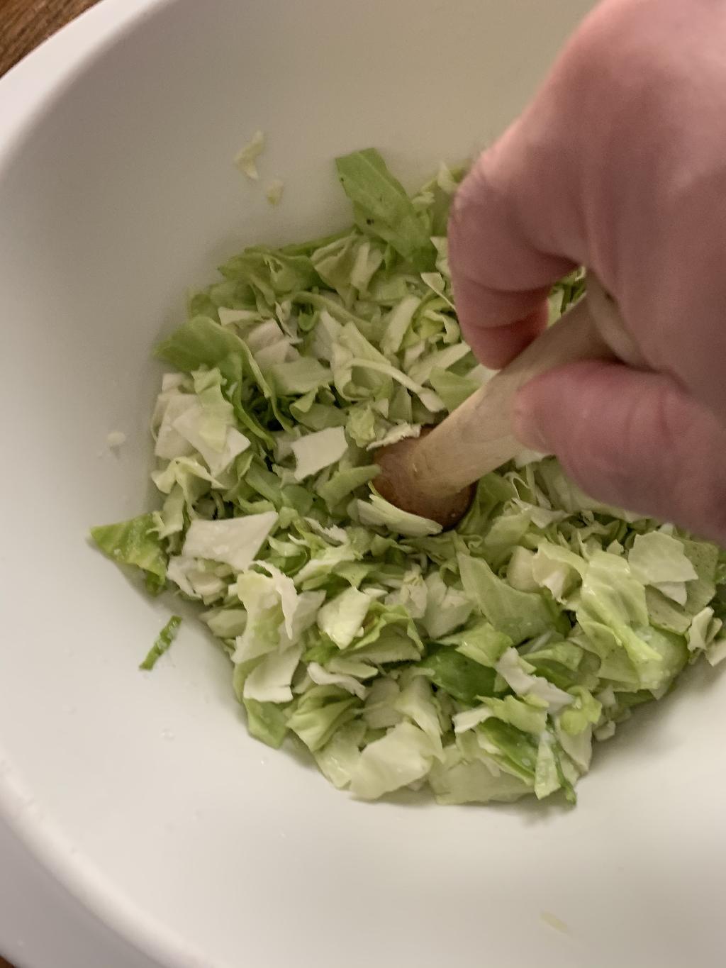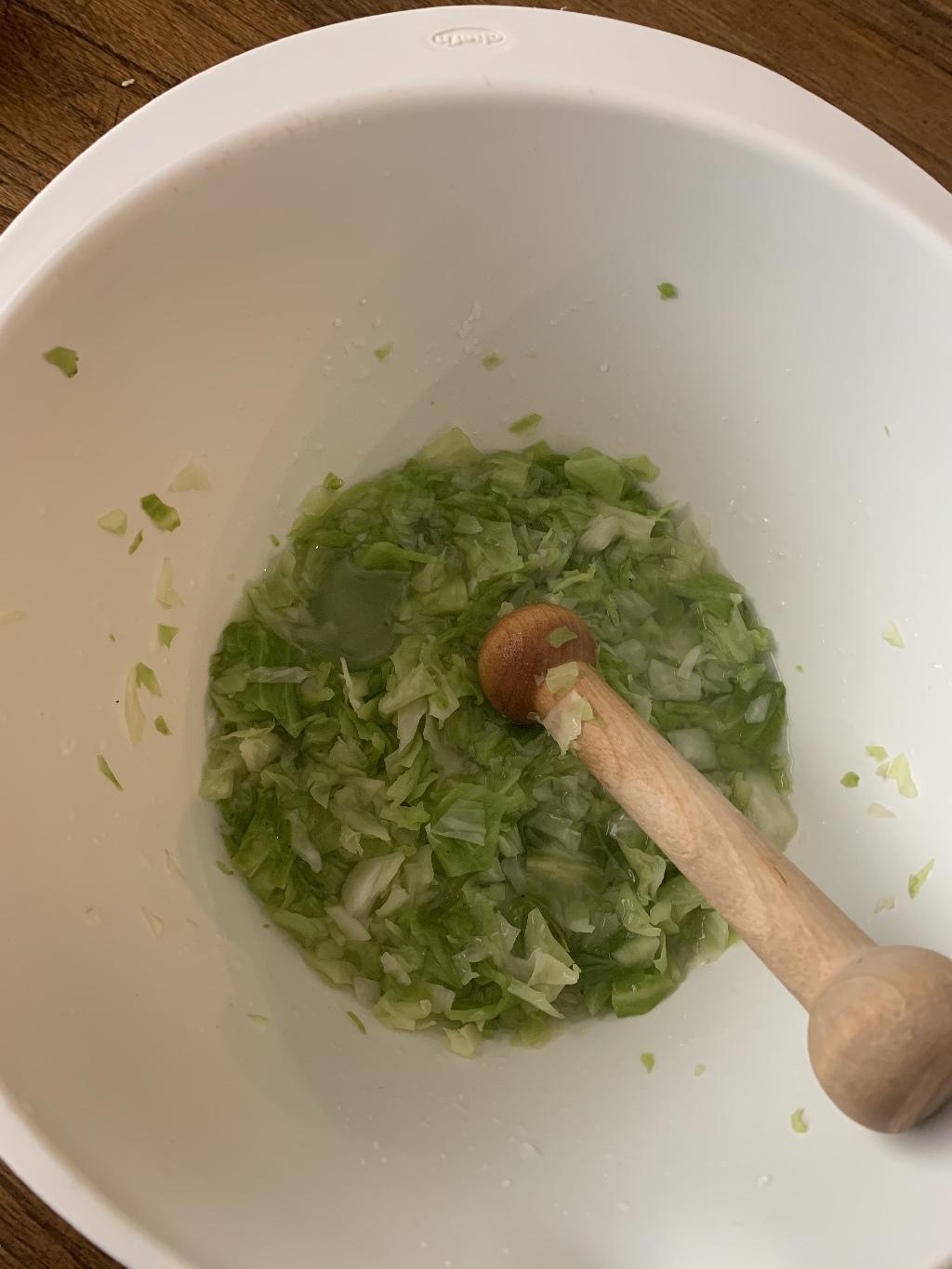 Step #2 Put into mixing bowl and cover with 1 1/2 tbsp of salt. Work the salt into the cabbage with your hands then allow to rest for 30 minutes. This will help draw the moisture out of the cabbage. Using a mallet or pestle, crush the cabbage in the mixing bowl, this will help release more water from the cabbage.