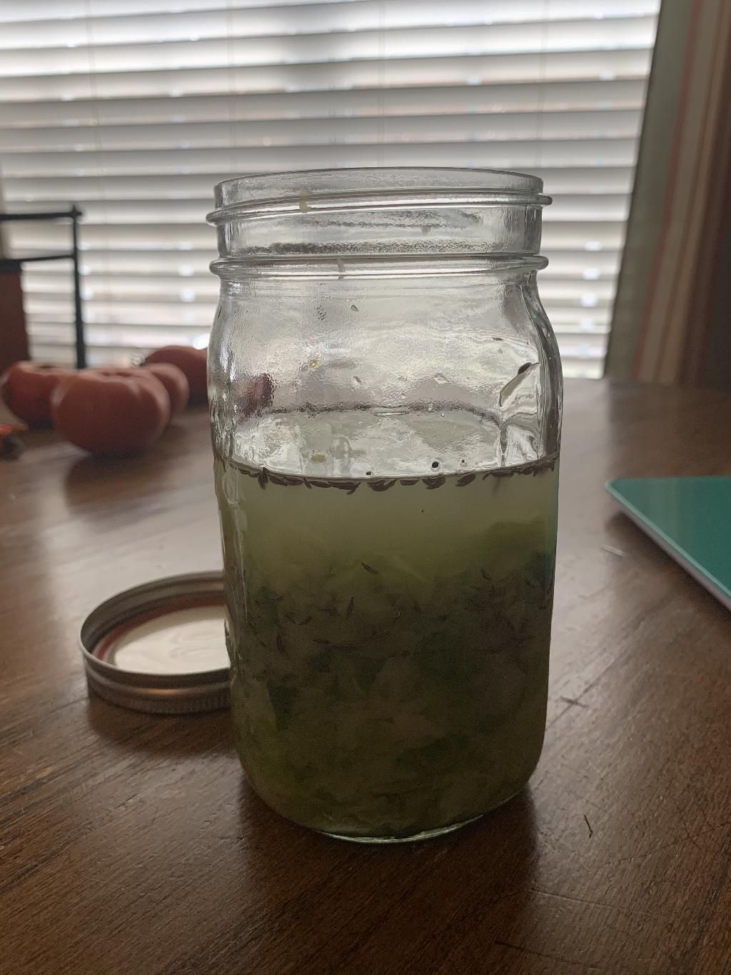 Step #4 Move your crushed cabbage to a clean, empty mason jar and submerge it with the water extracted from the cabbage leaves. Your cabbage should be completely submerged by the liquid, if not mix 1 cup of water with 1 teaspoon of salt, then pour into mason jar. Add 1 tablespoon of caraway seeds to your mason jar. You'll probably want to weigh your cabbage down with something heavy, they sell mason jar weights for this, but I used a zip lock bag filled with salt. You need to ensure all the leaves are completely submerged; any leaves not submerge may spoil. Place mason jar in warm place for about a week to ten days, burping every few days to release air. After one week, place in refrigerator.