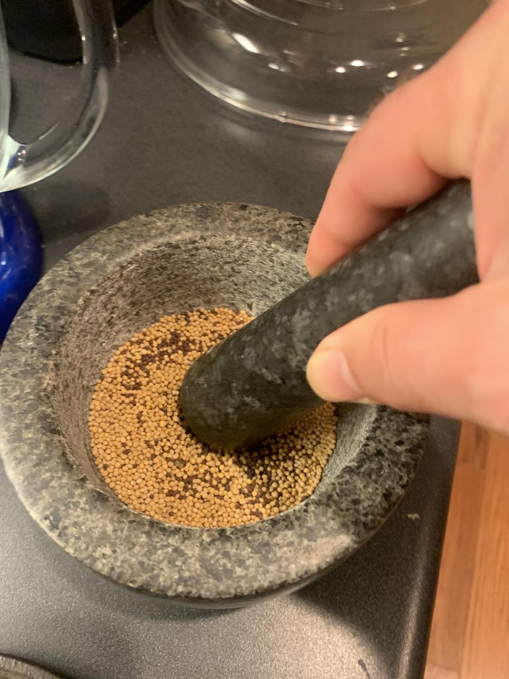 Step #1 Add Brown Mustard seeds and Yellow mustard seeds to mortar and lightly crush.