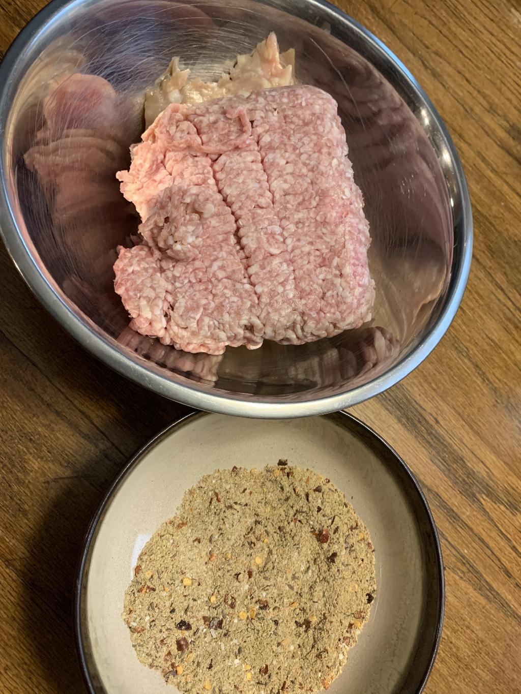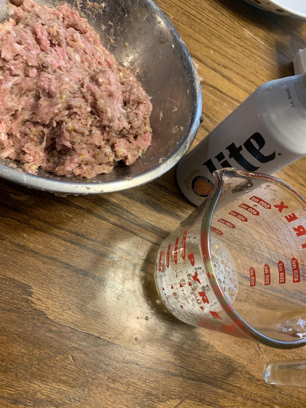 Step #3 Combine ground pheasant and pork meat, seasoning mix and 1/4 cup Pilsner beer in a mixing bowl, using your hands, incorporate everything together. Place in refrigerator to 30 minutes.