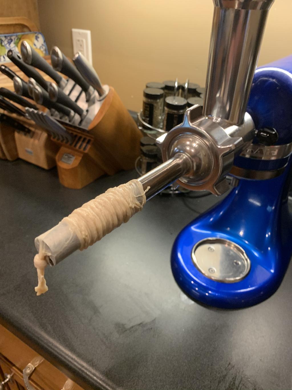 Step #4 Meanwhile, soak sausage casing in cold water. Rinse with warm water and place on sausage stuffing tube. Tie knot into casing end.