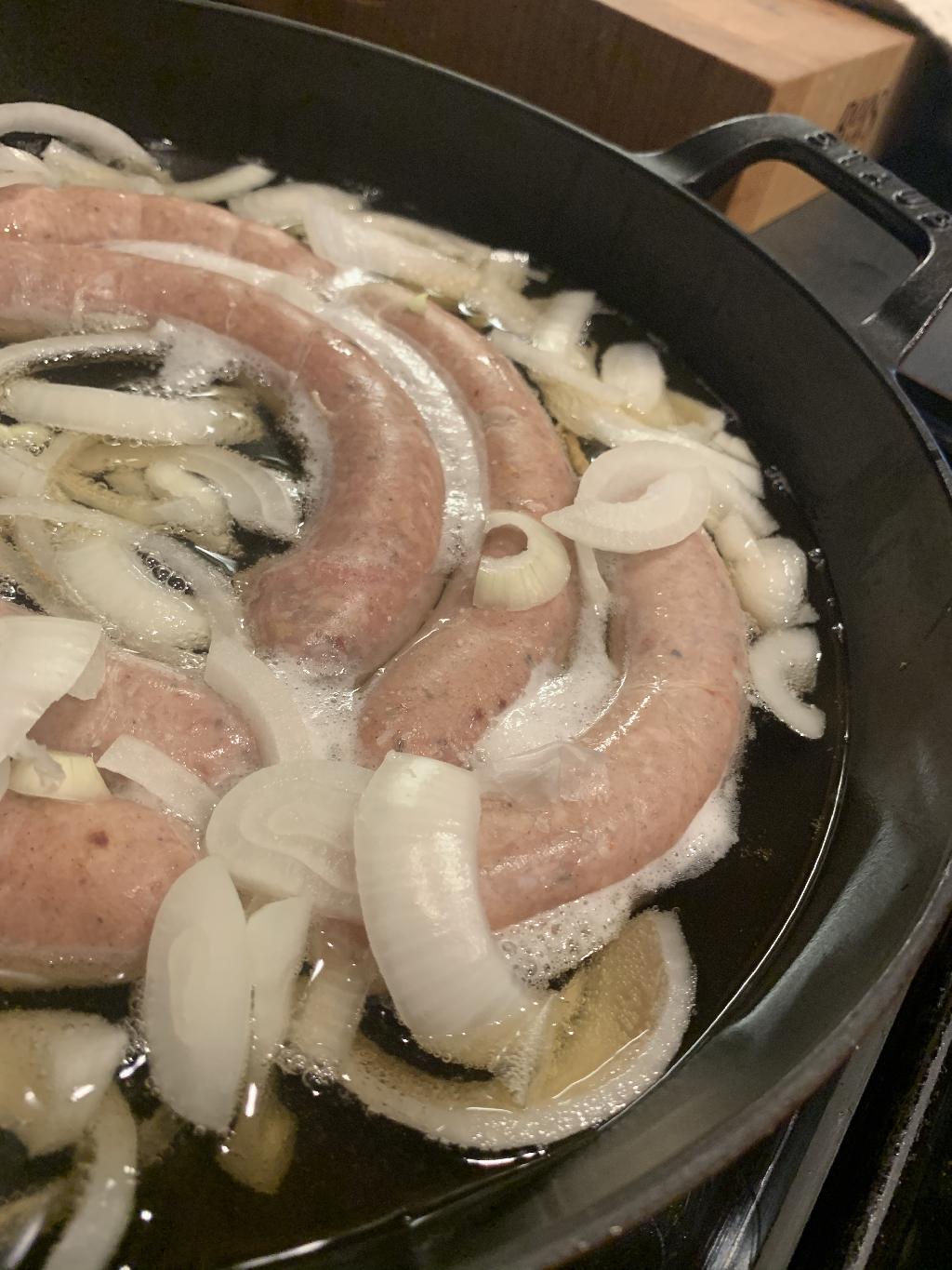 Step #7 Place in skillet and cover with remained of pilsner beer and sliced up sweet yellow onion. Poach in liquid for a few minutes, but don't cook all the way through.