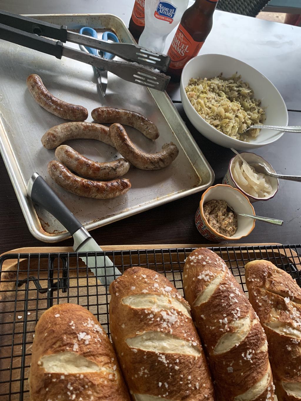 While I'm not Germany by any means, I do love Germany food and Sauerkraut is one of my favorites. If my mom had told me what it was as a little kid, I probably would have never eaten it. As a kid, I was never much of a vegetable person, especially the green kind. My mom would be shocked seeing me make my own Kraut. I actually grew the cabbage in my garden, sadly I planted several different plants but only one survived long enough to become kraut. Making your own kraut can take several weeks, so you would need to plan this meal several weeks in advance if you were making everything from scratch. Of course, nobody would fault you for buying it off the shelf. The same can be said for the stone ground mustard, pretzel buns and even the pheasant bratwurst. You can buy all these things already made. I decided to make everything myself just to have the experience of doing it. I'm not a chef, so some of these things I'm doing for the first time, it's a learning experience for me and I think that's what I enjoy the most about it. I try to document these recipes as much as I can, so I can go back and make them again or tweak them in the future.