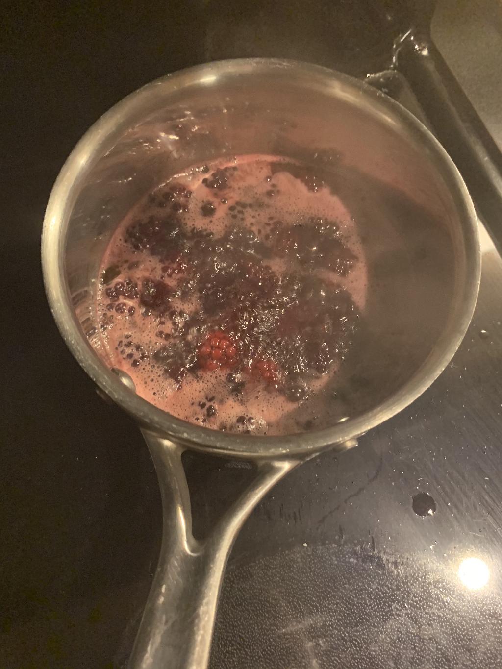 Step #3 Add Wine and Blackberries to a saucepan and bring to a boil. Add Salt. Allow to reduce by half then remove from heat.