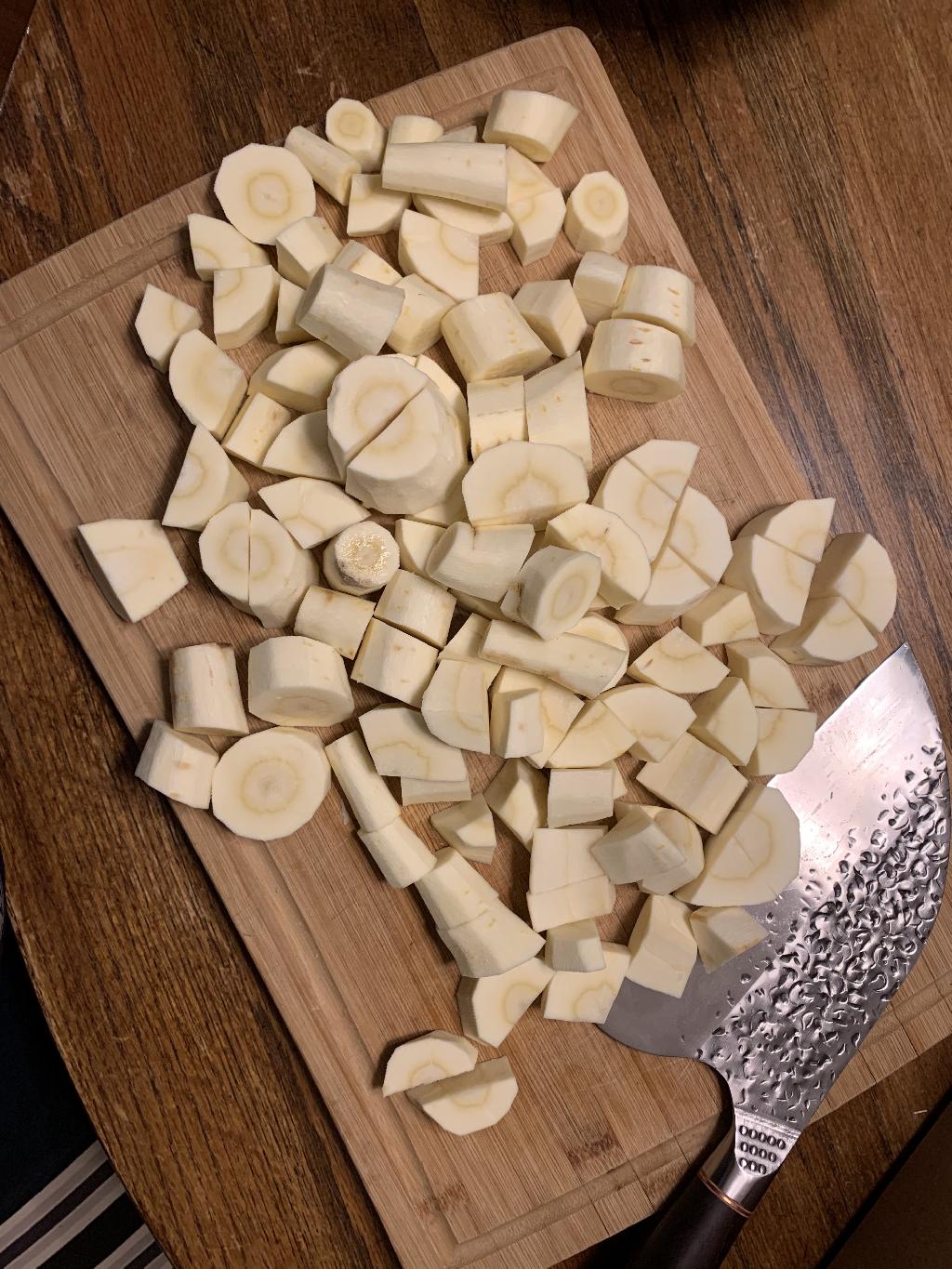 Step #3 Cube the parsnips into roughly same size pieces, about 1 inch.