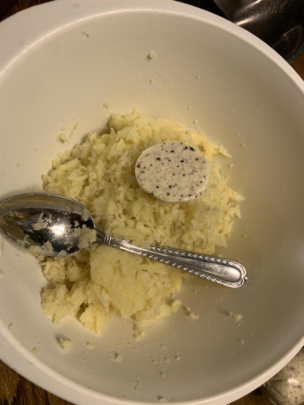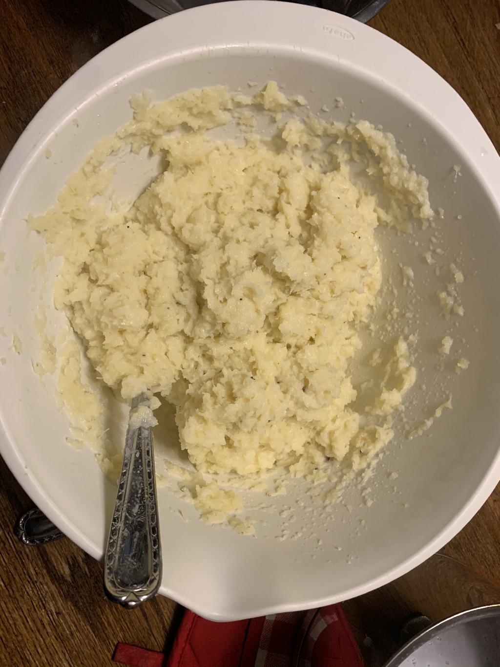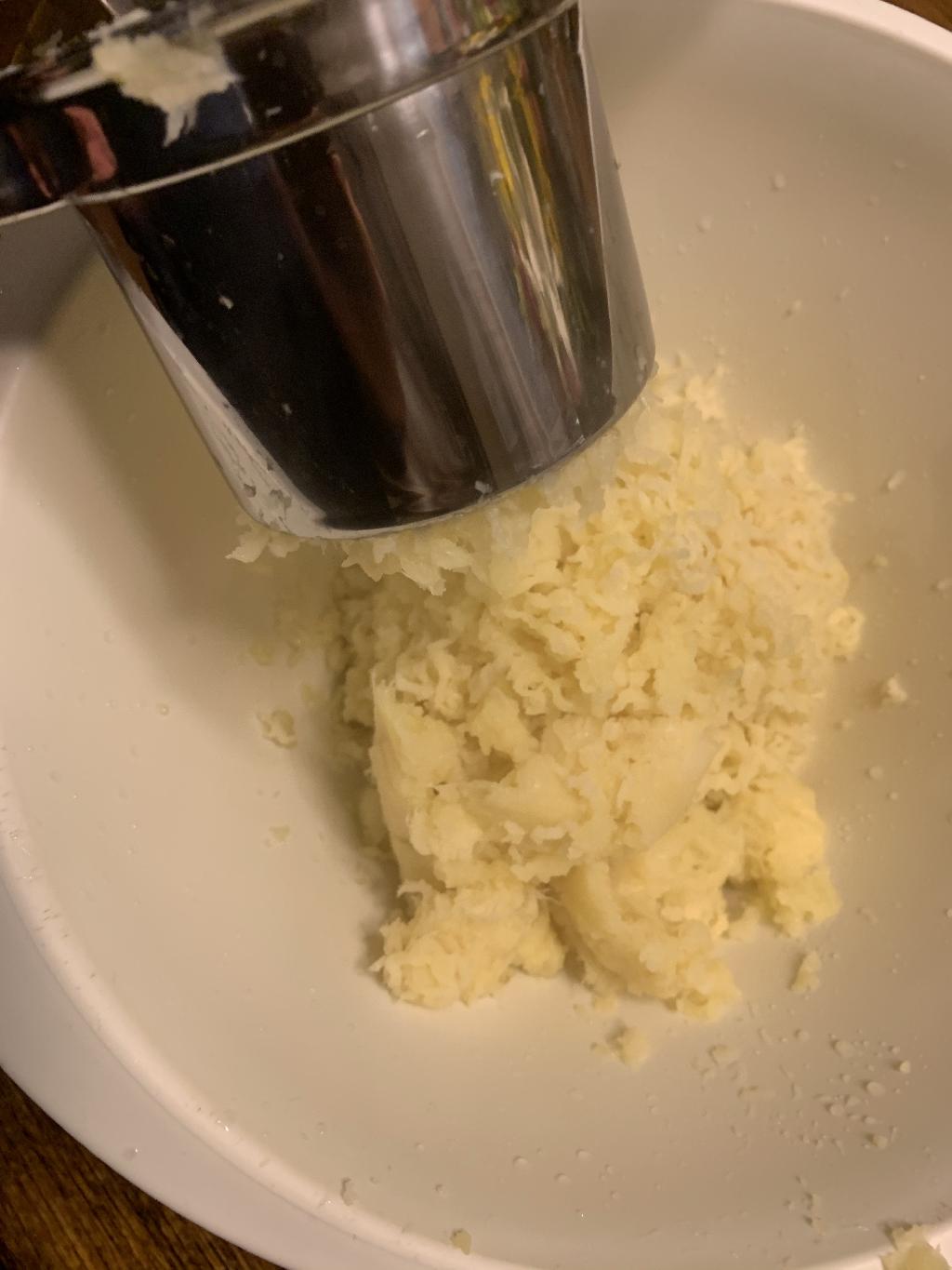 Step #6 Using a ricer, mash the parsnips into a bowl.