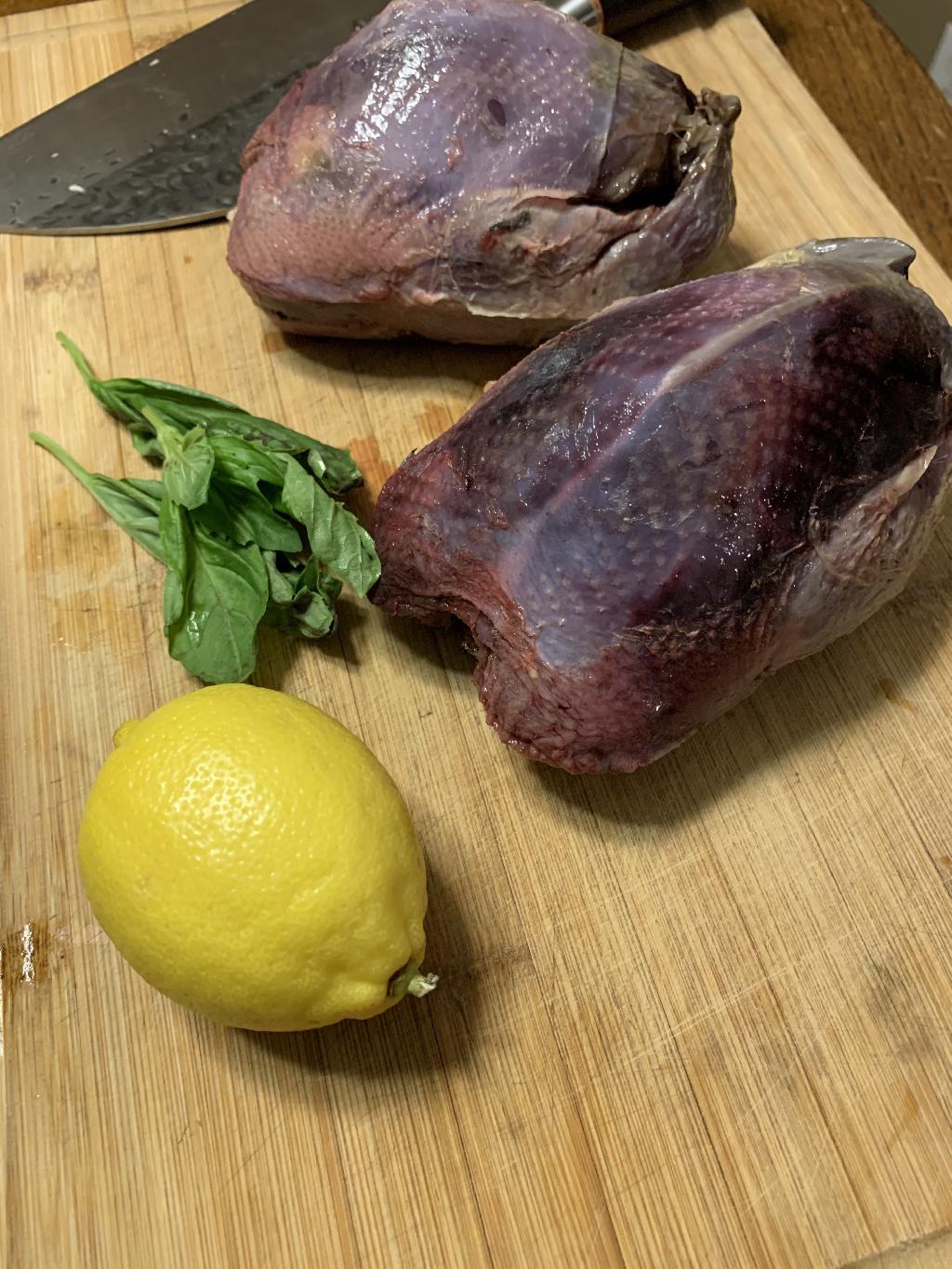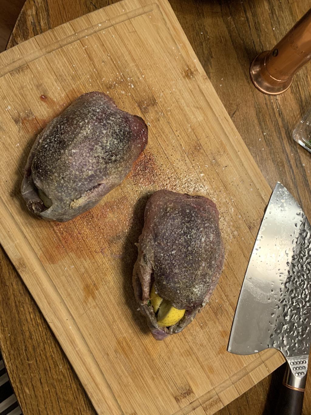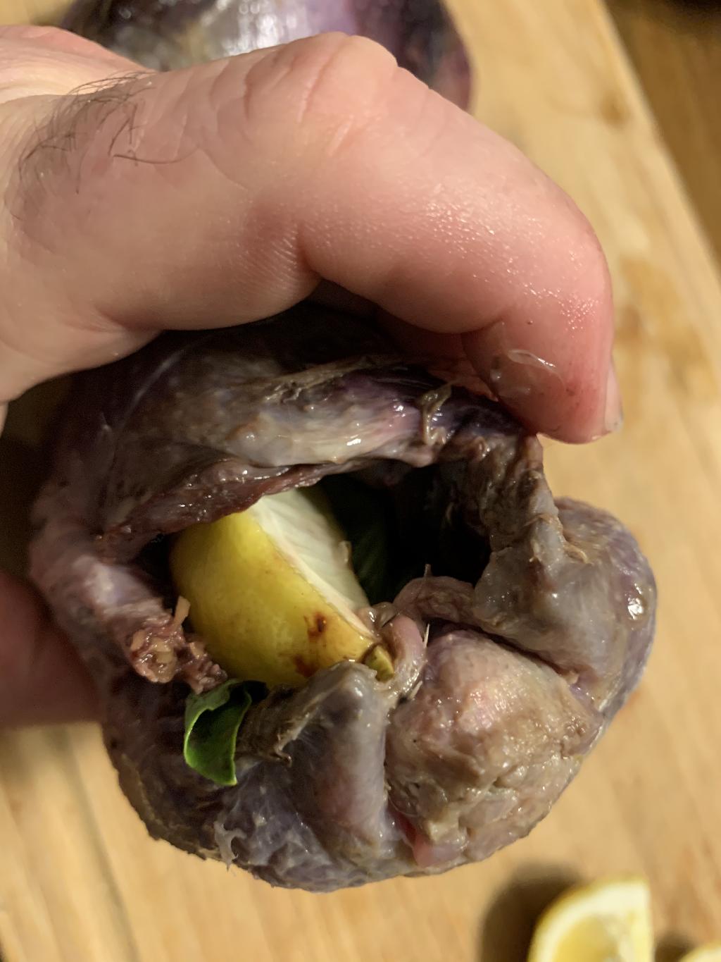 Step #2 Slice one lemon into quarters, then place two of the quarters into each bird cavity, or one depending on the size of your lemons.