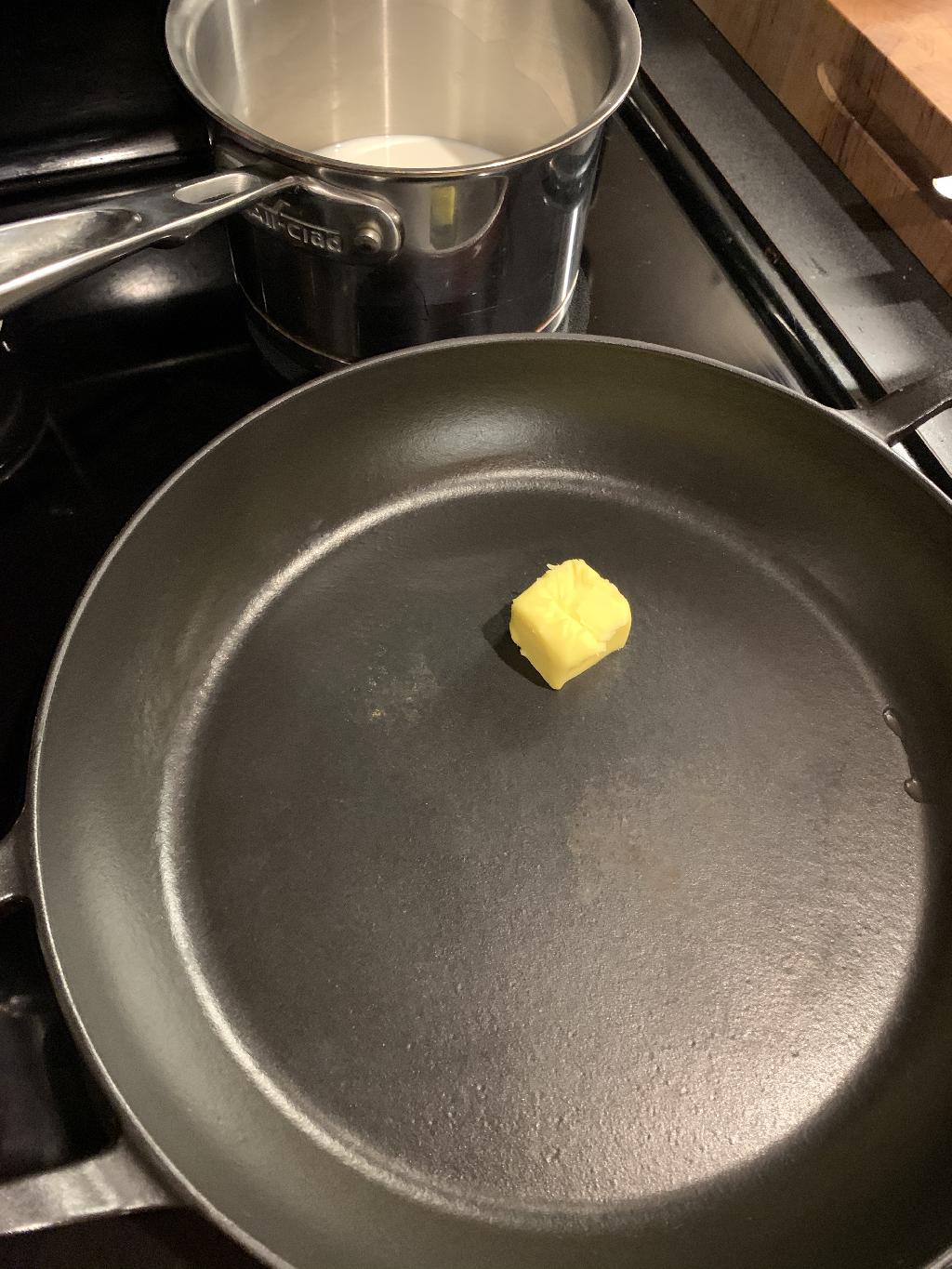 Step #4 Place oven safe skillet on the stove. Set heat to medium high and allow to get hot. Add two tablespoons of butter, I used Kerrygold Irish Butter.