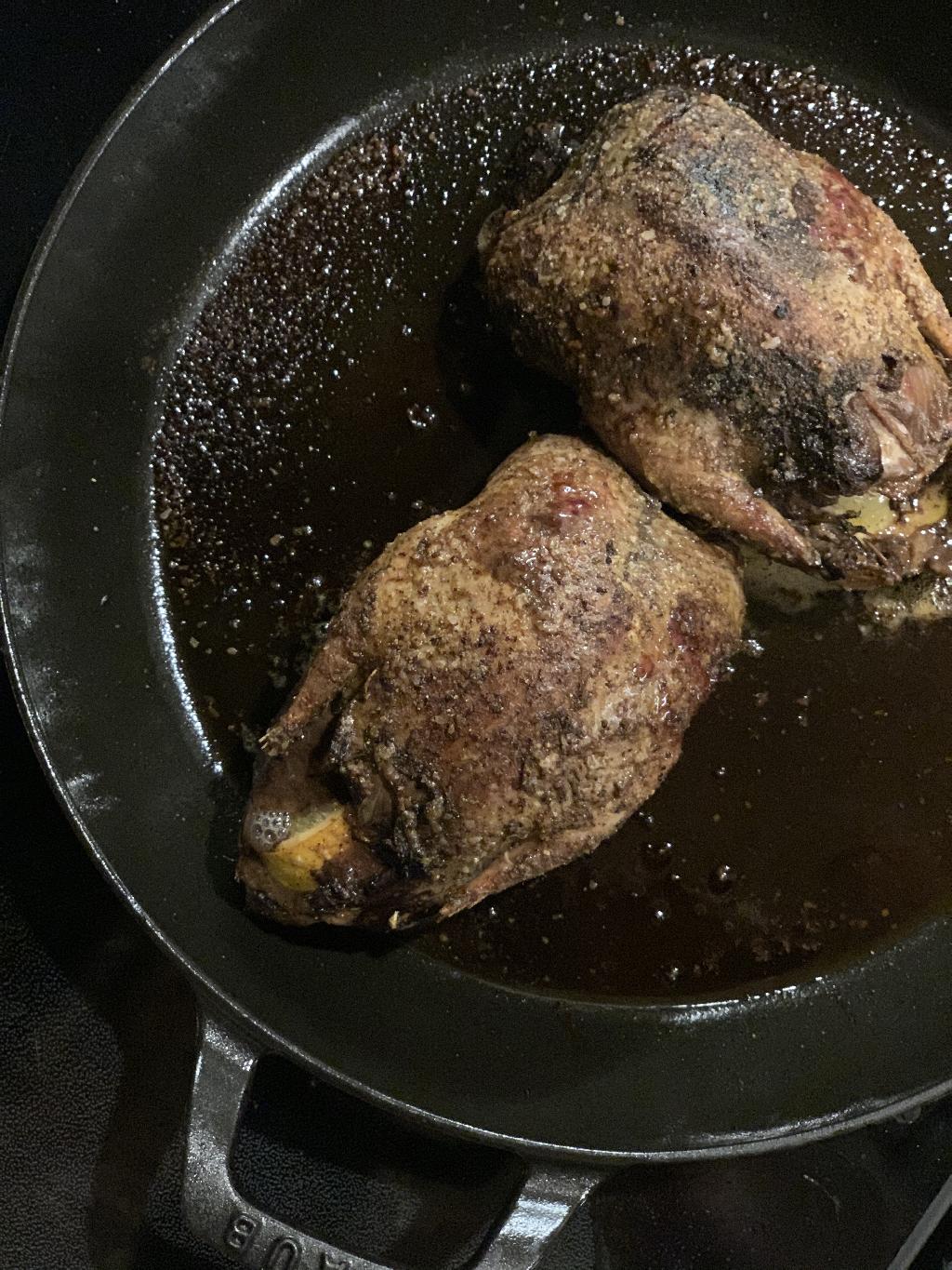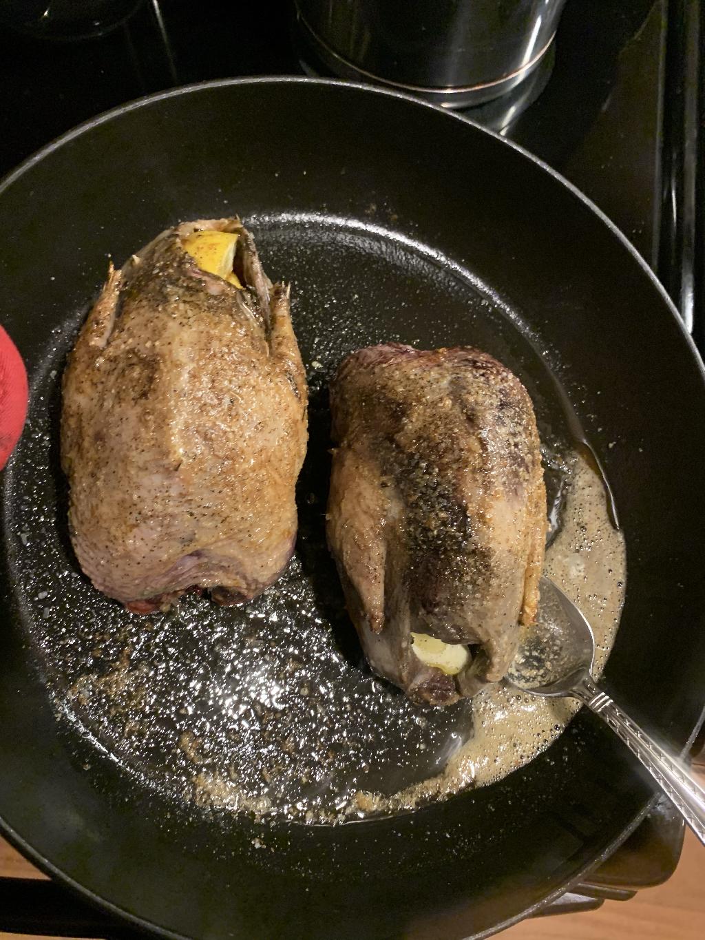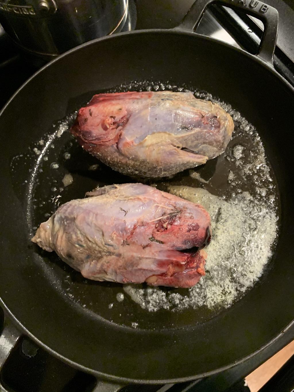 Step #5 Sear breast in hot pan for 2 minutes, turn the bird so the other side of the breast gets seared for another minute.