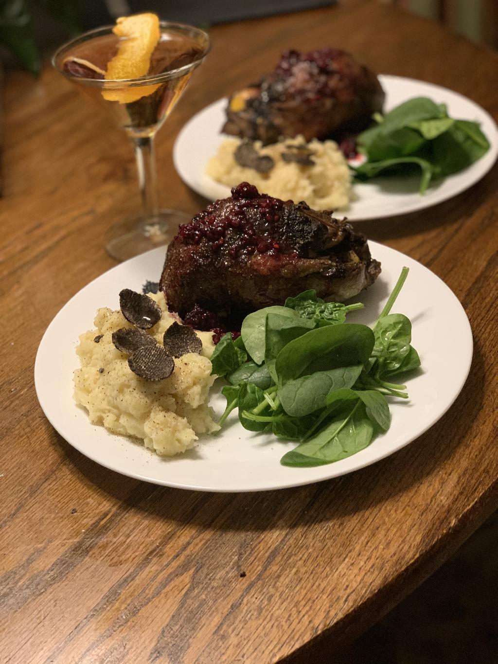 Step #8 To plate. Place on plate and drizzle the Black Berry wine sauce all over. Sprinkle the top with chopped basil. Added Mashed Parsnips and shave some black truffle over top.