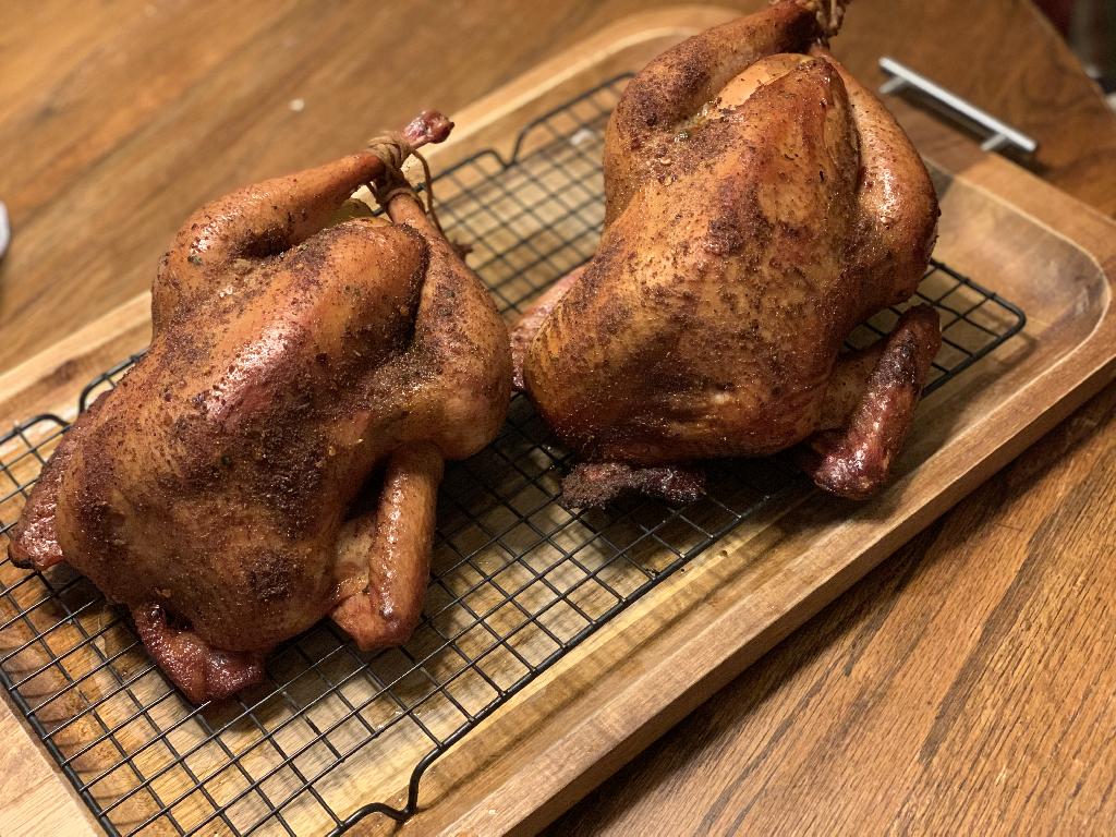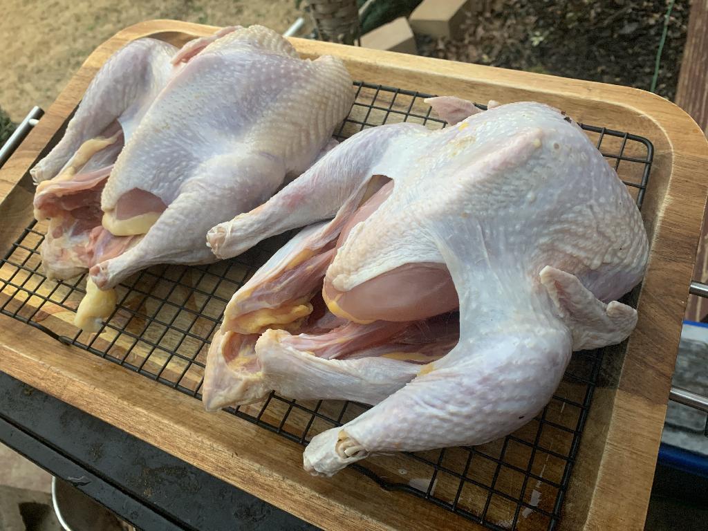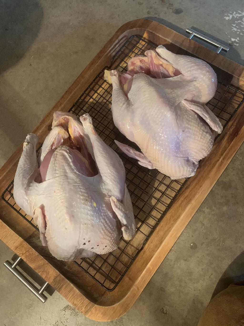 Step #3 Brine birds 8 hours in refrigerator or cooler filled with ice. Remove birds from brine and pat dry with paper towels. Place on wire rack, then place back in the refrigerator for another hour, allowing the skin to dry. Starting soaking wood chips in water.
