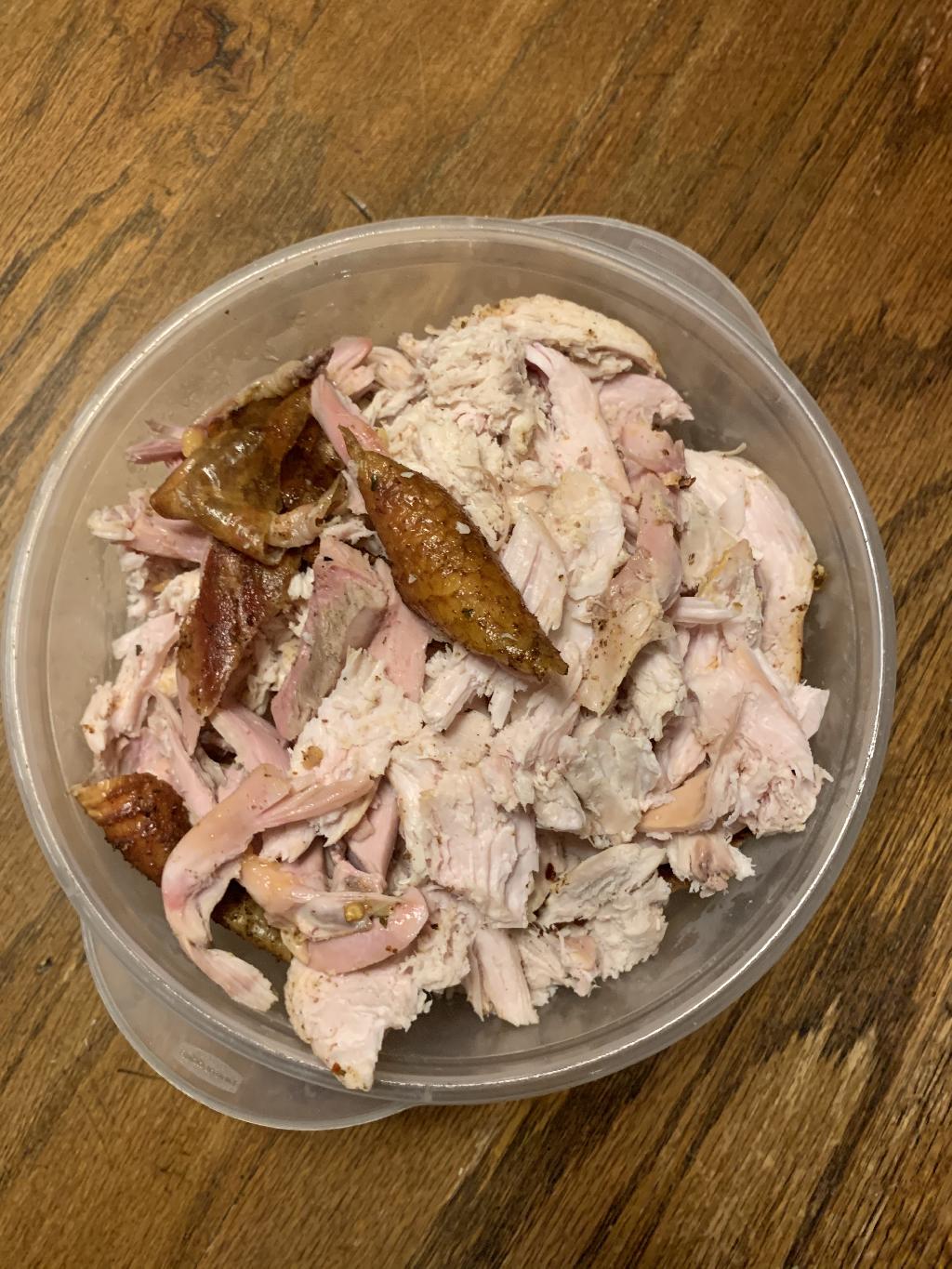 Step #8 Allow the pheasant to cool, then shred the meat from the bone.