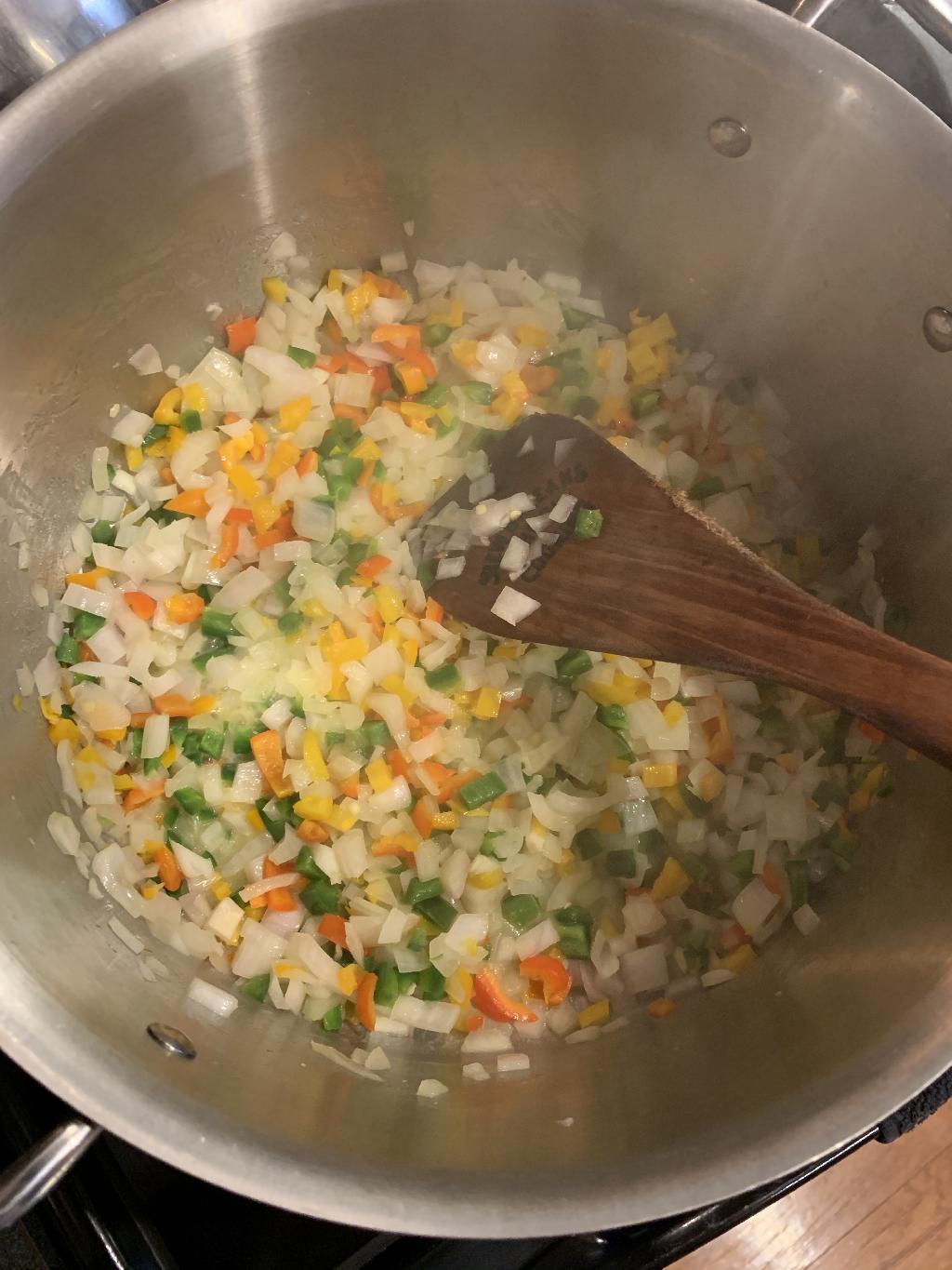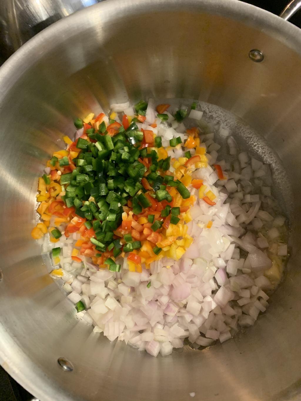 Step #2 Add 2 tablespoons of butter to large stock pot and set heat to medium high. Allow butter to melt then add onions and peppers. Sprinkle in some salt. Allow to cook for 5 to 7 minutes