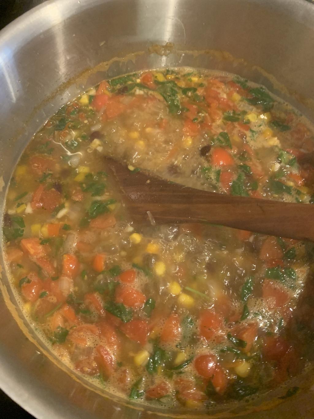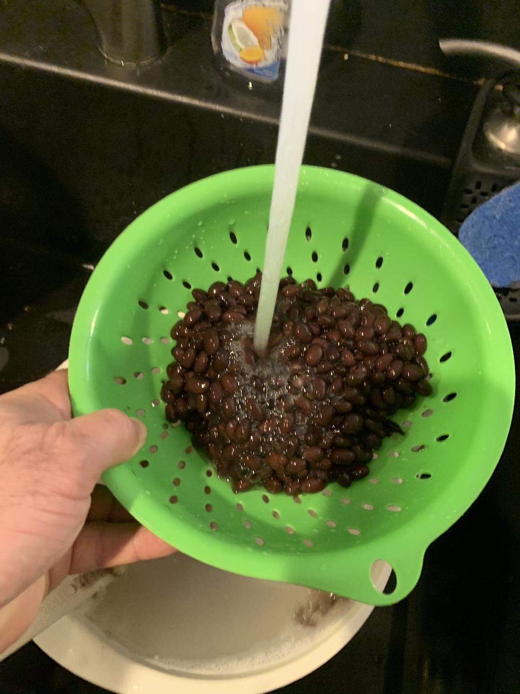 Step #4 Rinse your black beans in colander and add to pot. Add one 15 ounce can of whole corn and one 4.5 ounce can green chili's. Sprinkle in some more salt.