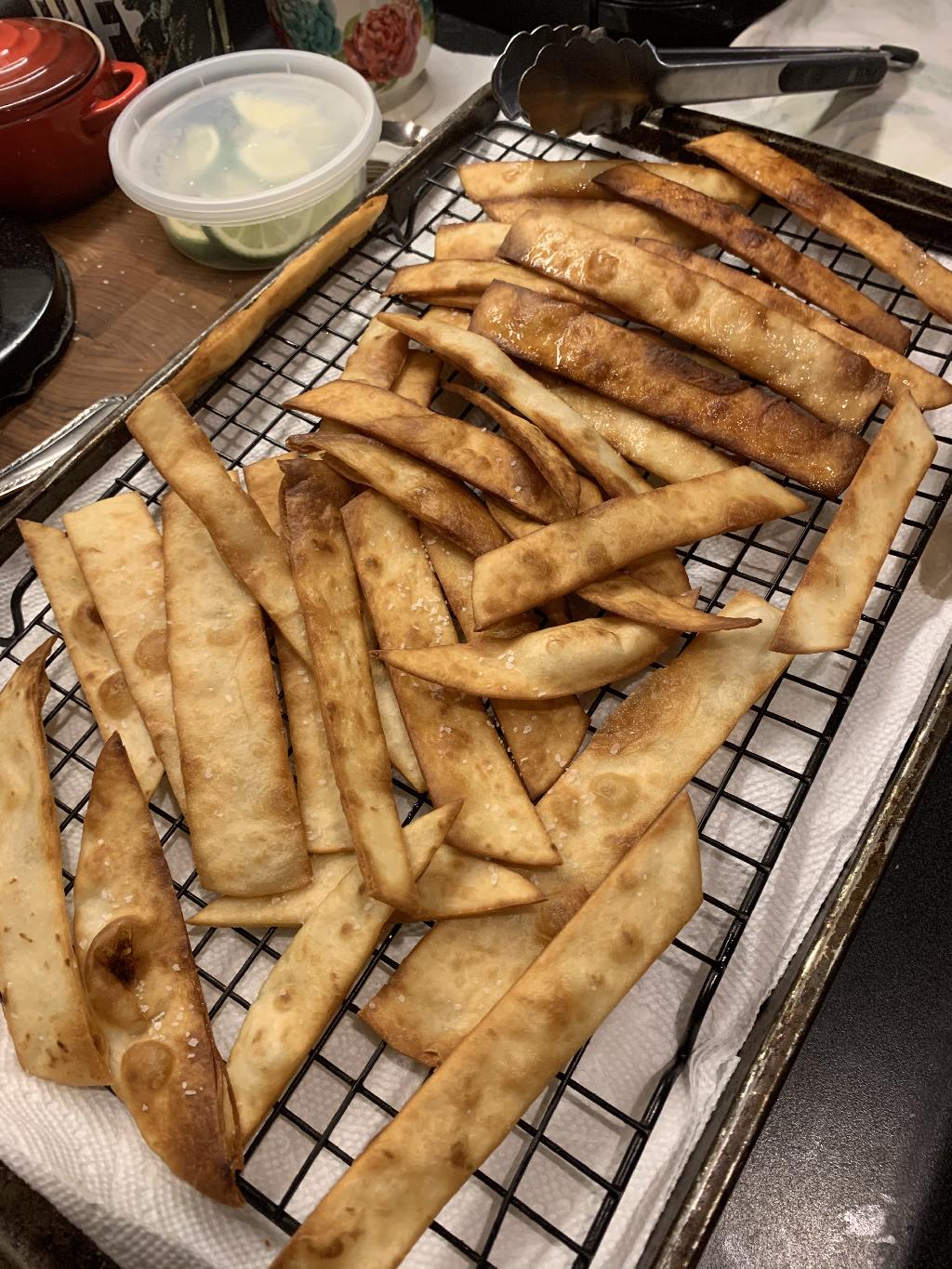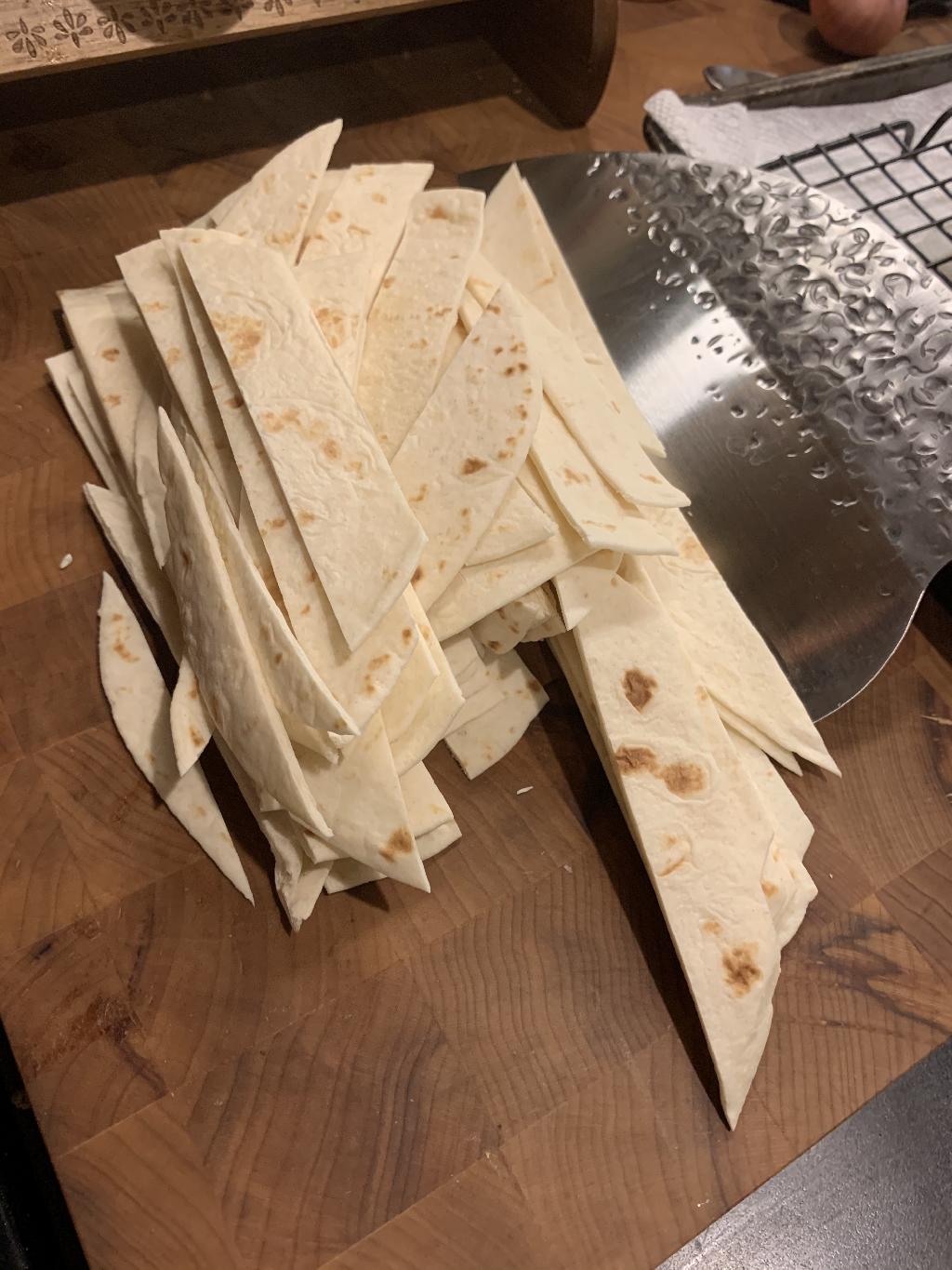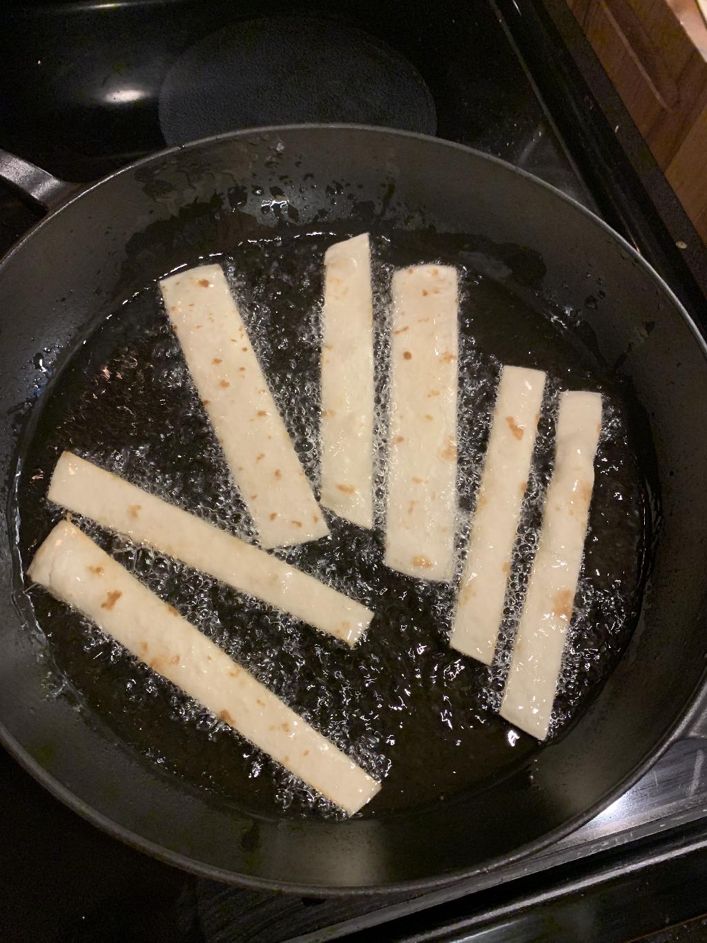 Step #11 Heat up a skillet on medium high heat, adding enough vegetable oil to cover the bottom of the pan. Cut some flour tortilla into thin strips.