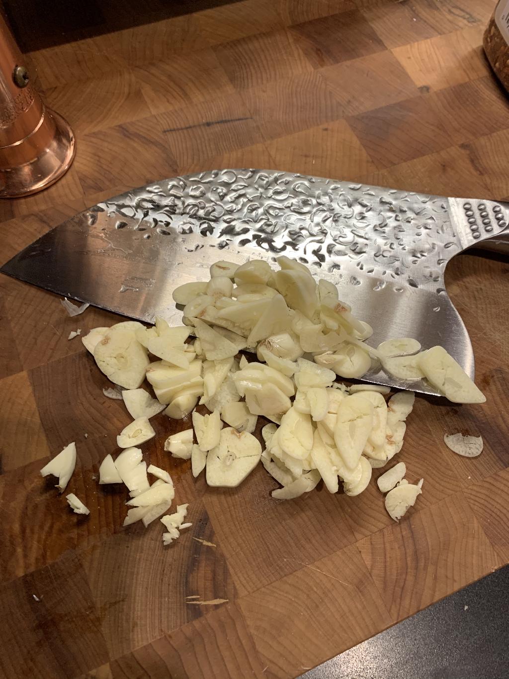 Step #2 While Sesame Oil is heating up, chopped your garlic into thin strips.