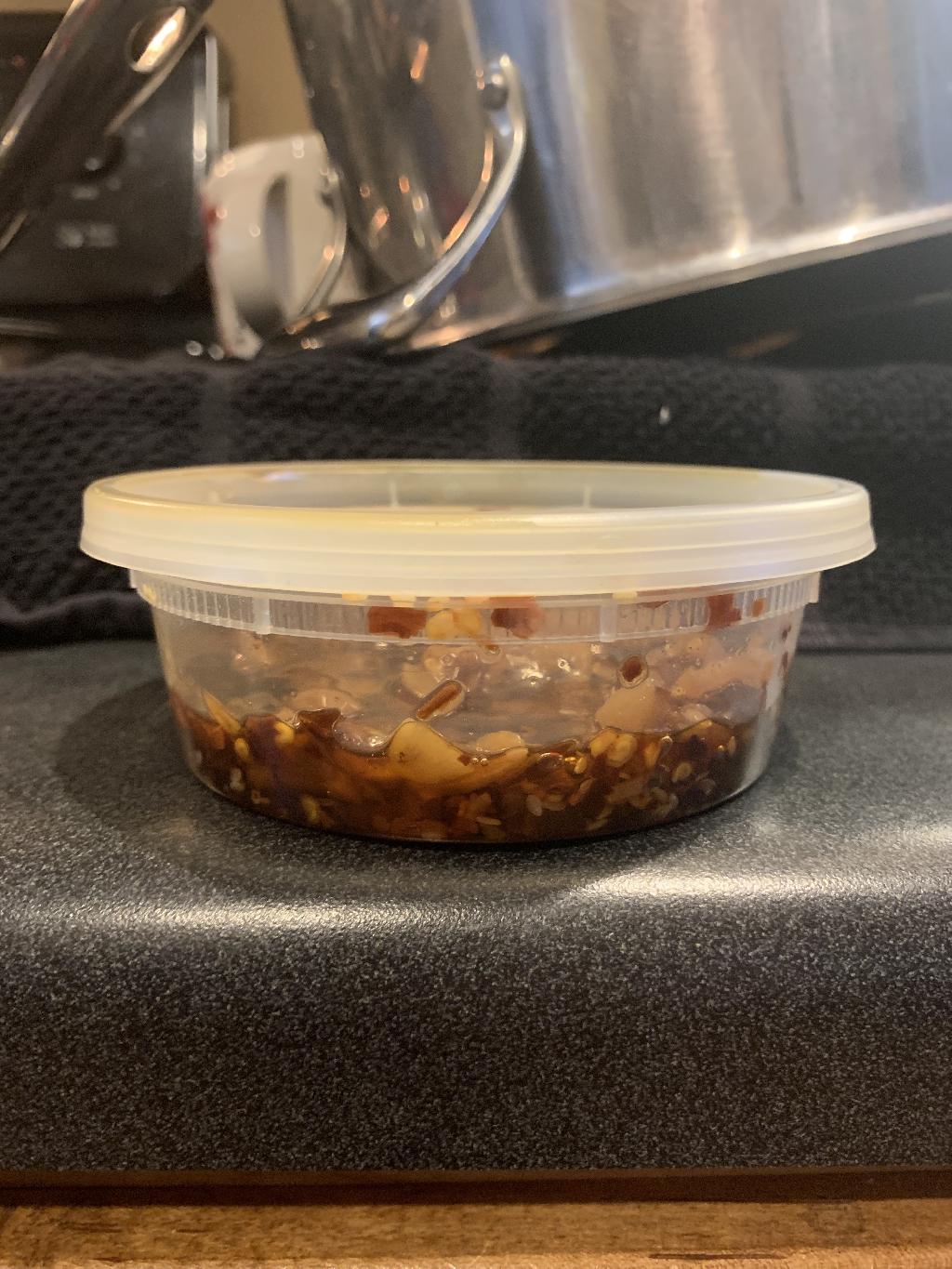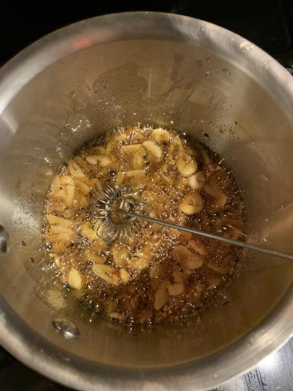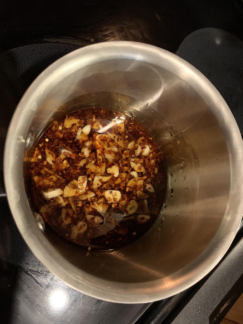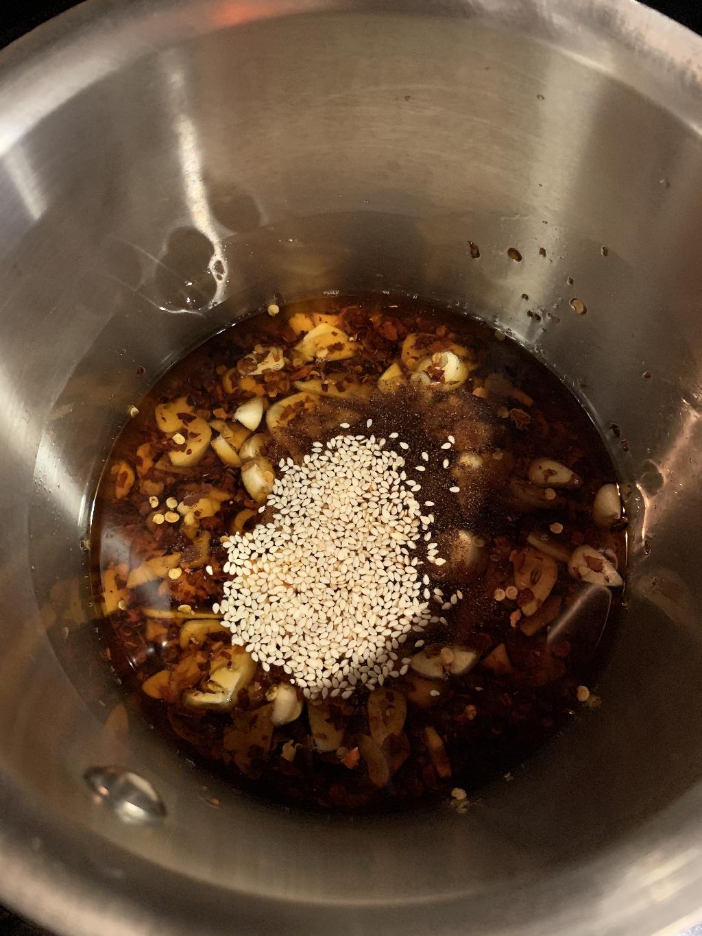 Step #3 Added sliced Garlic, Crushed Red Pepper and Chinese Five Spice to Sesame Oil.