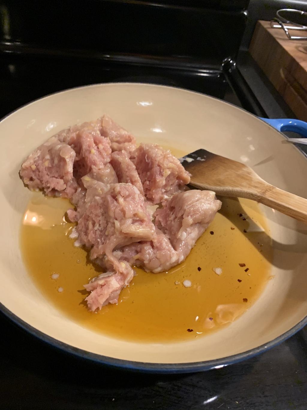 Step #5 Add 3 tbsp of the hot sesame oil to a skillet and set heat to medium high. Add Ground Pheasant