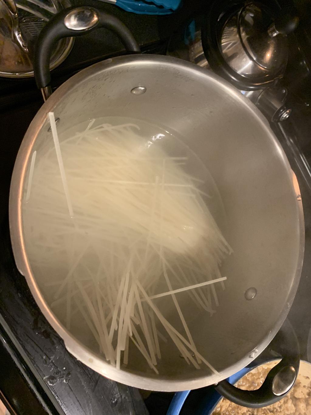 Step #12 Bring 8-12 cups of water to a boil in large stock pot. Add 2 handfuls of salt to the water. When boiling, add noodles and cook 4 to 6 minutes.