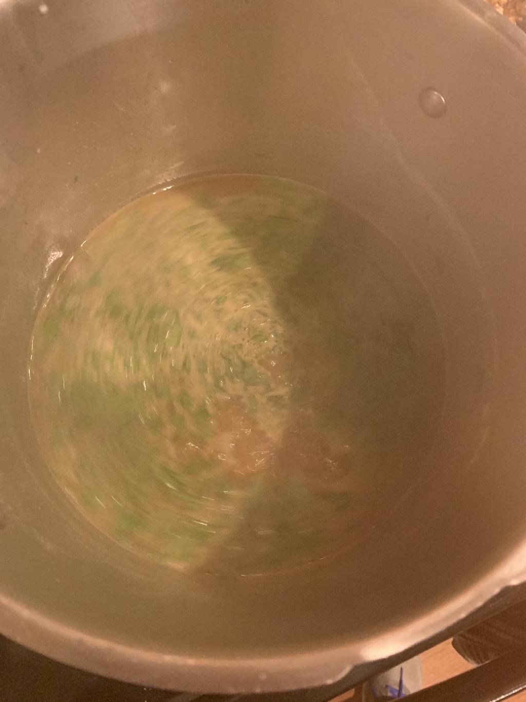 Step #13 While noodles are cooking, add pheasant stock to another sauce pot. Set heat to medium and allow to warm