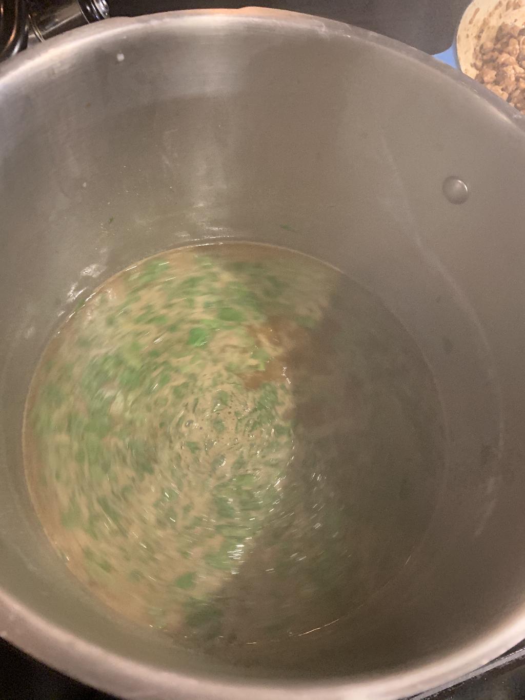 Step #14 Add the rest of soy sauce mixture and spinach to sauce pot. Allow to reach a simmer then turn off heat