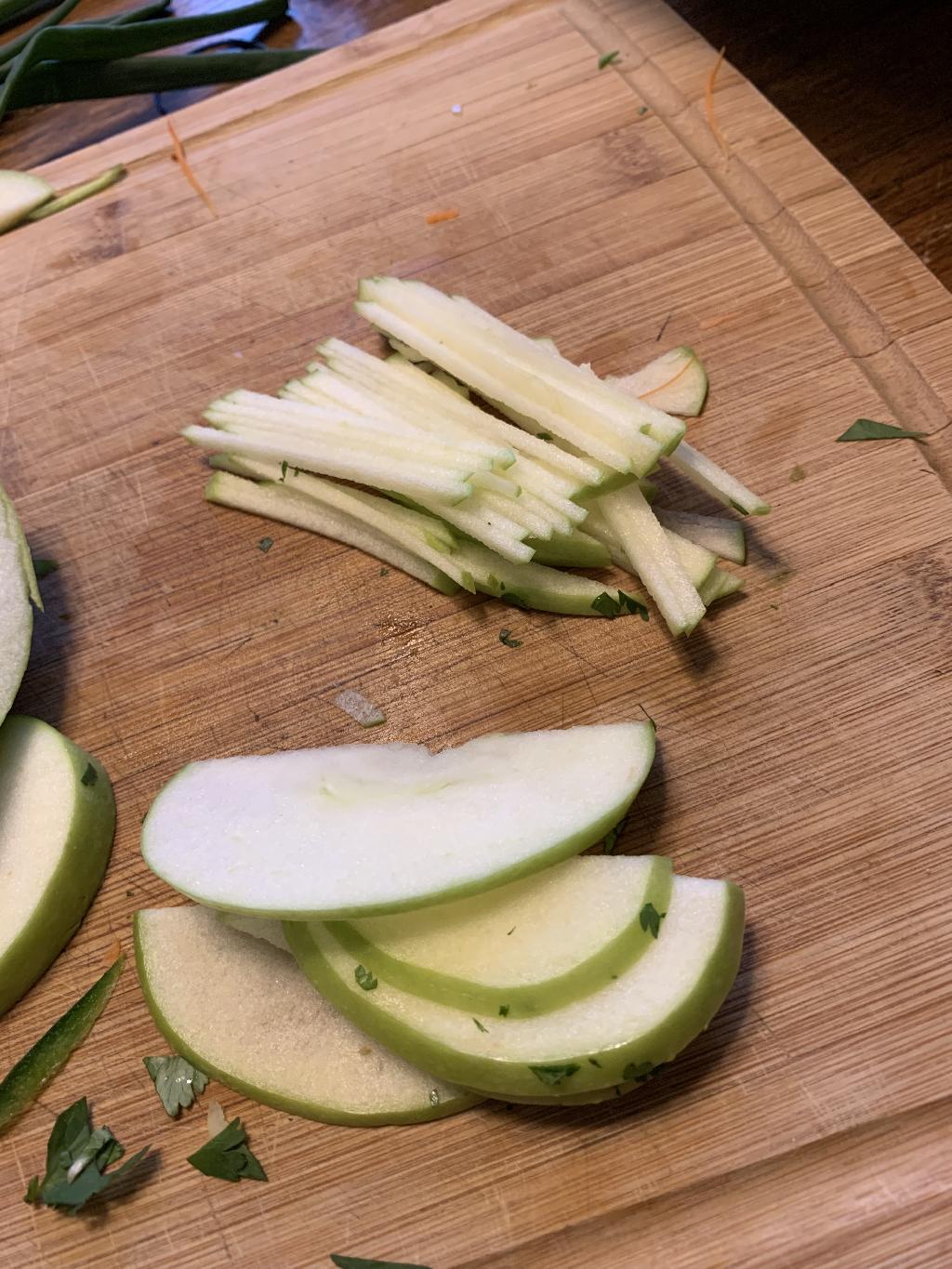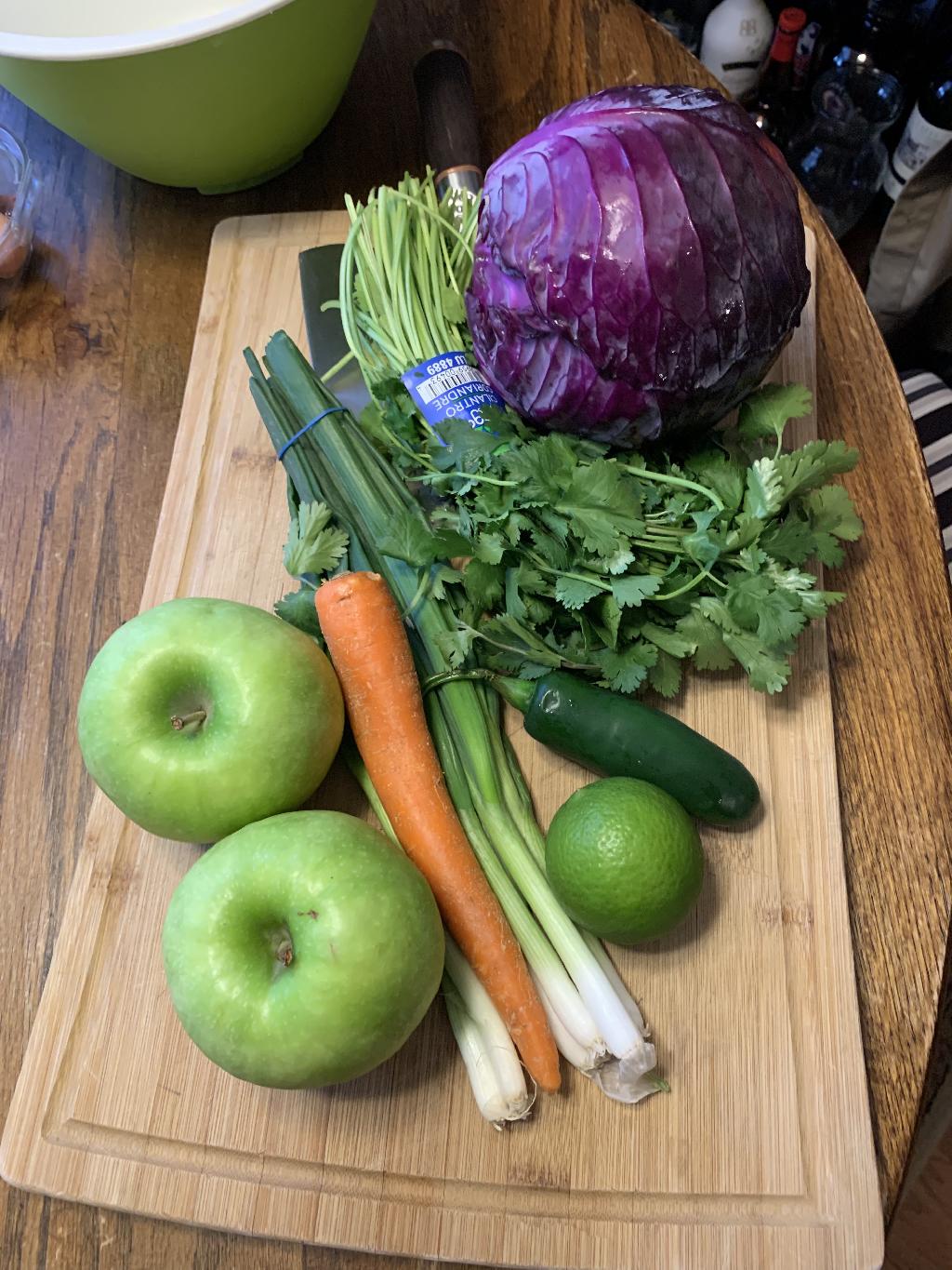Step #7 Chop your purple cabbage, then add everything to a mixing bowl and sprinkle with salt. Squeeze juice form one lime into bowl, this will help keep the apples from turning brown.