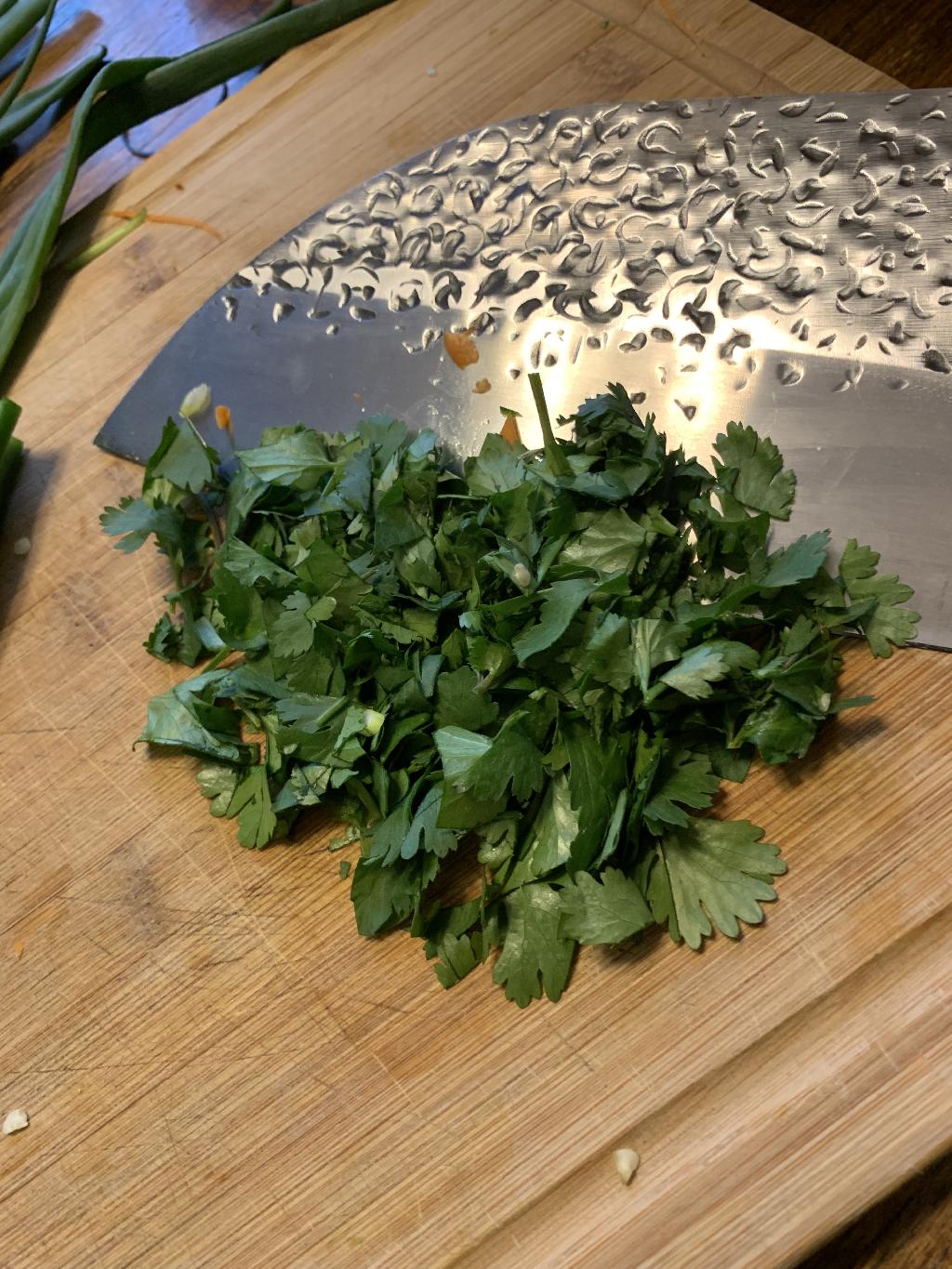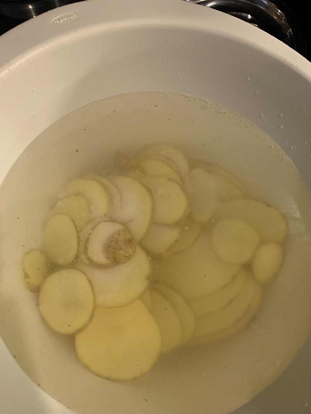 Step #3 Fill a bowl with cold water. Add potatoes and a couple handfuls of salt to the bowl. Allow to soak for 15 minutes. The water should start to turn brownish as the potatoes release their starch. Dump the scratchy water into the sink, then replace with more clean cold water. This time, use your hands to stir the potatoes slices around in the water, water should start to turn brownish again. Once water is brownish again, dump, rinse and repeat ... until the water is mostly clear. Once the potatoes water looks clear, add a couple tablespoons of white distilled vinegar and allow to set another 20 minutes.
