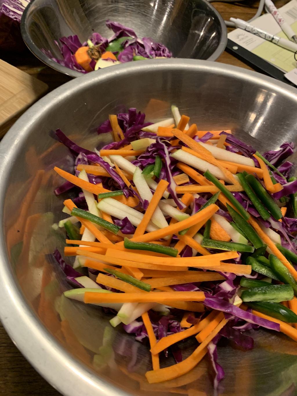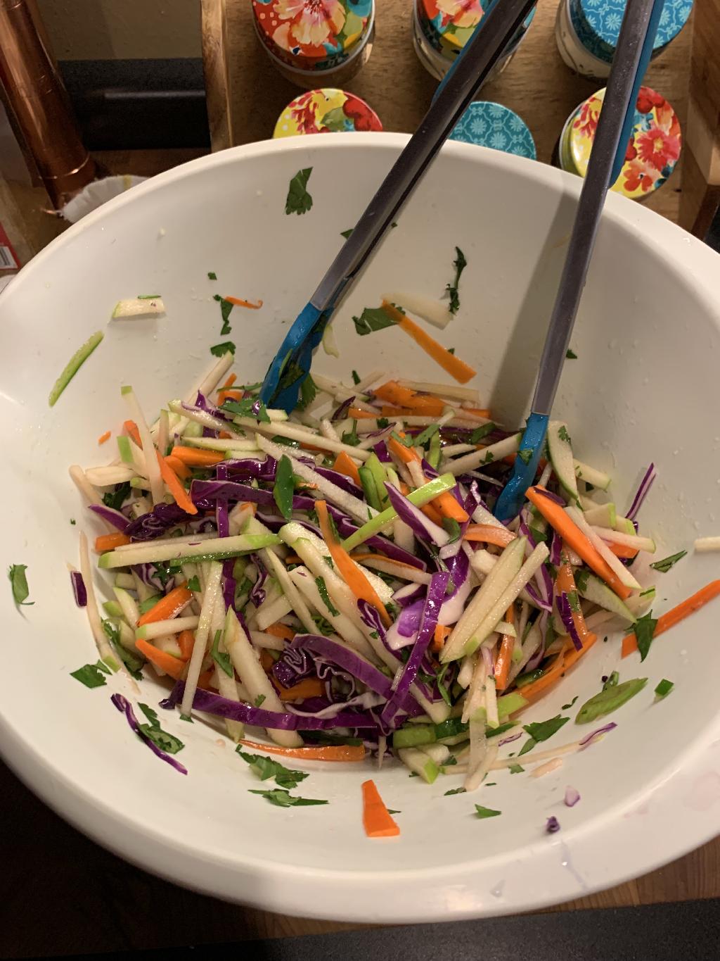Step #9 Pour dressing into slaw, using thongs to combine, place in refrigerator while preparing the rest of the meal.