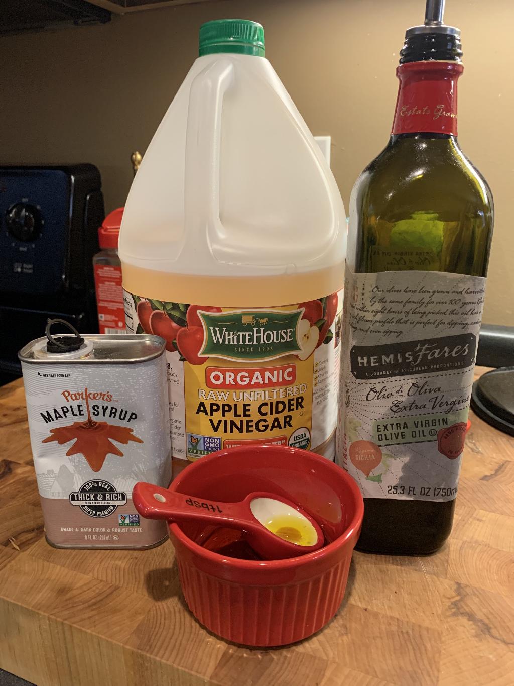 Step #8 Combine Apple Cider Vinegar, Olive Oil, Maple Syrup and a pinch of salt in a small bowl, whisking to combine.