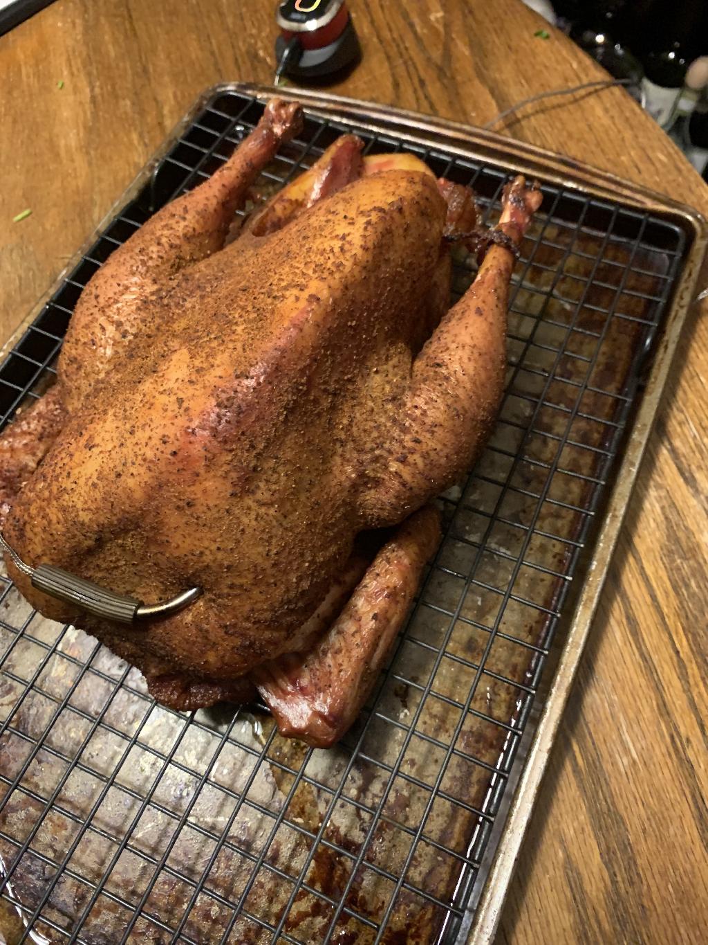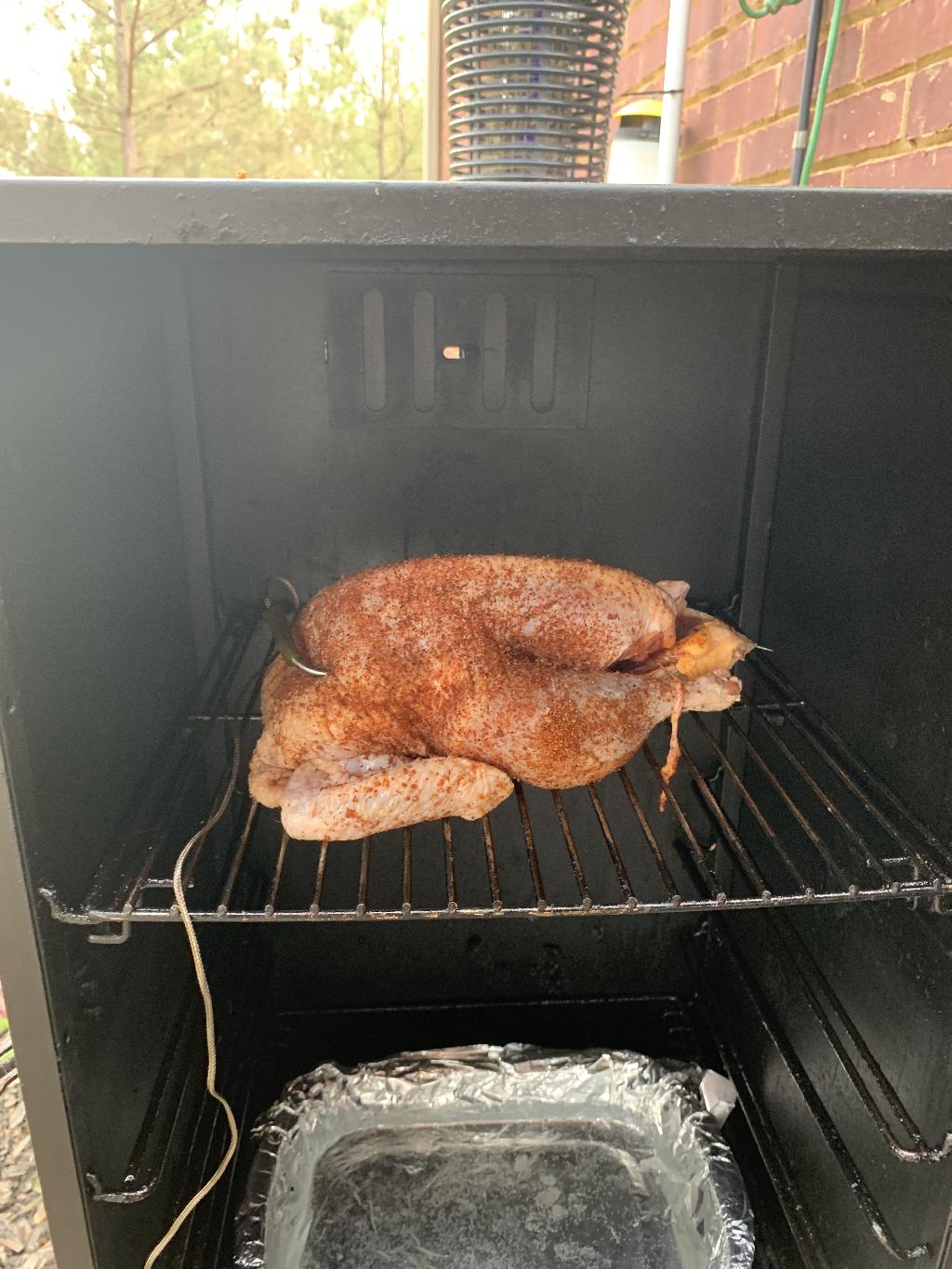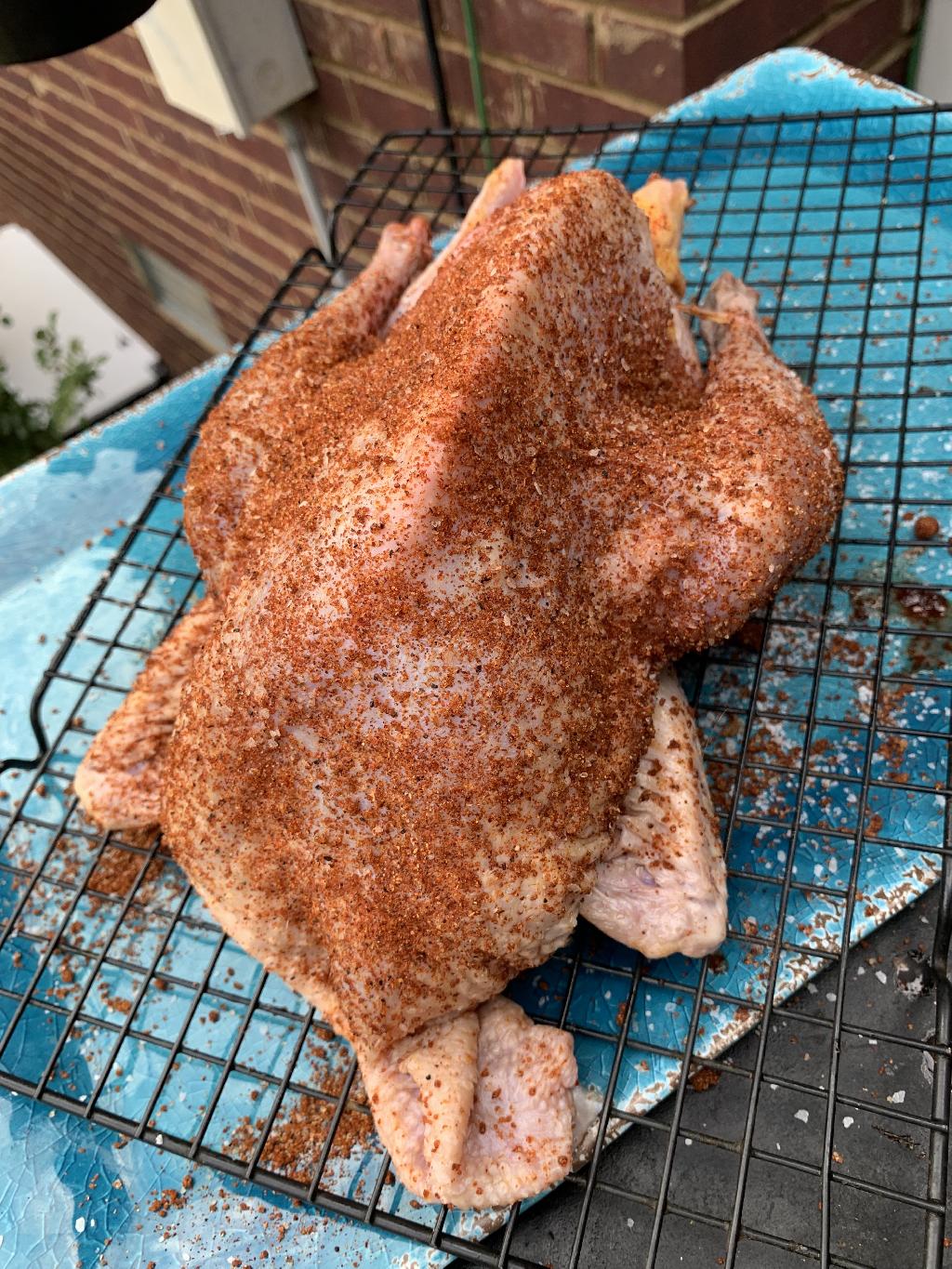 Step #1 Soak wood chips for at least 30 minutes. Remove birds from fridge, spray outside of birds with cooking spray, sprinkle all over with salt, including the cavity, then liberally coat with BBQ seasoning/rub