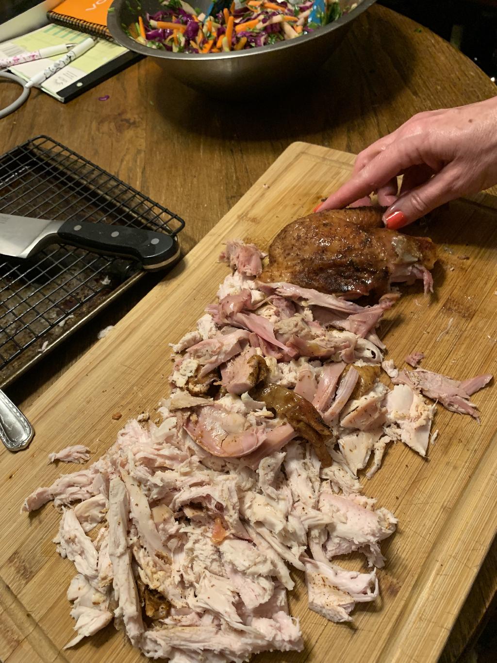 Step #5 Shred the meat form the birds. You can save the carcass to make a pheasant stock with later.