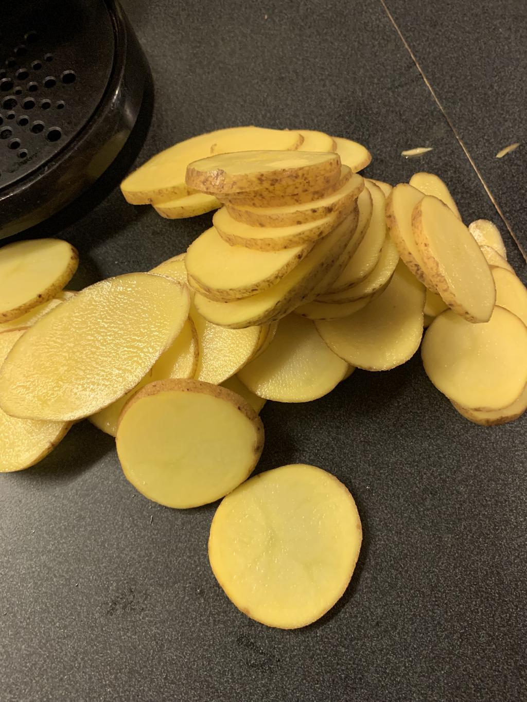 Step #2 While the oil is getting hot. Wash the potato's, then using a mandilion, slice the potatoes into 1/8-inch-thick slices