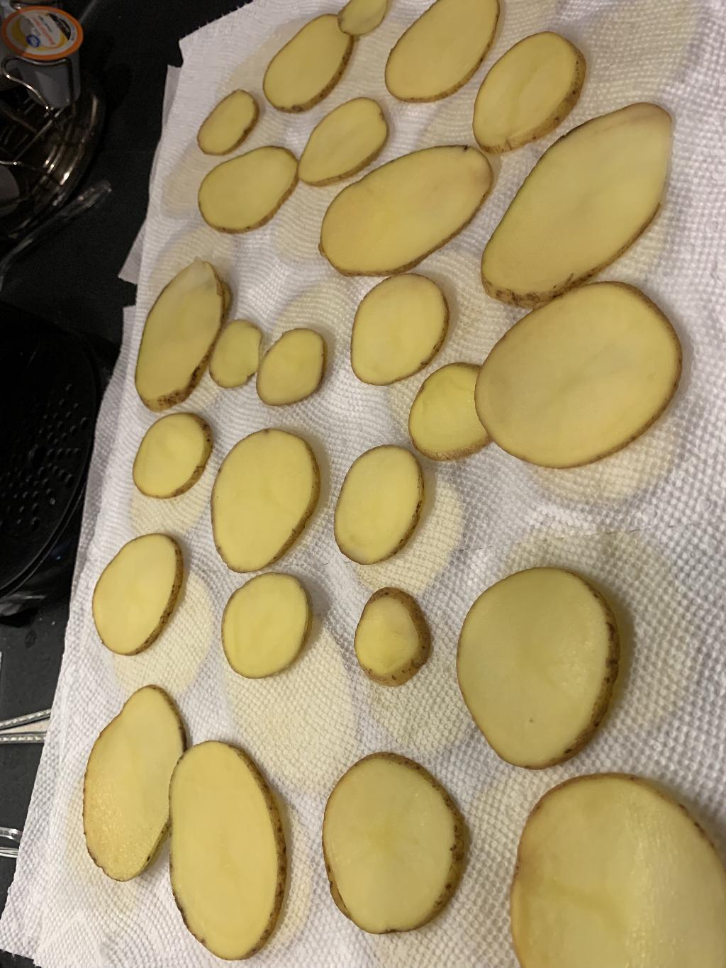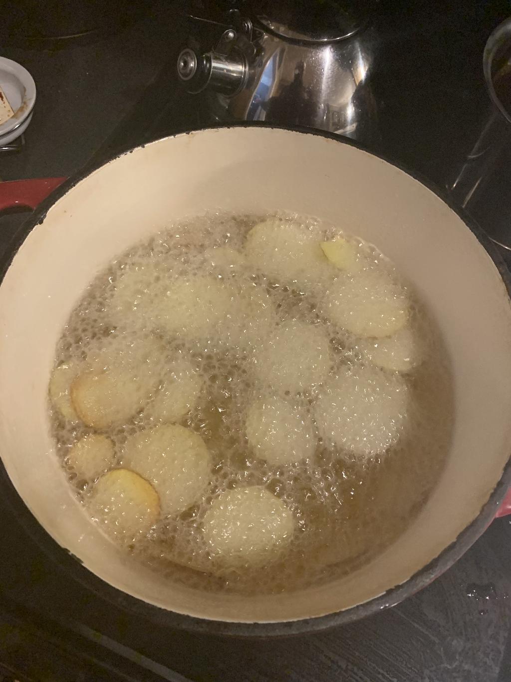 Step #5 Once dry. Add a small batch of the potato slices to hot oil. Allow to cook for 5-10 minutes, until they start to brown.