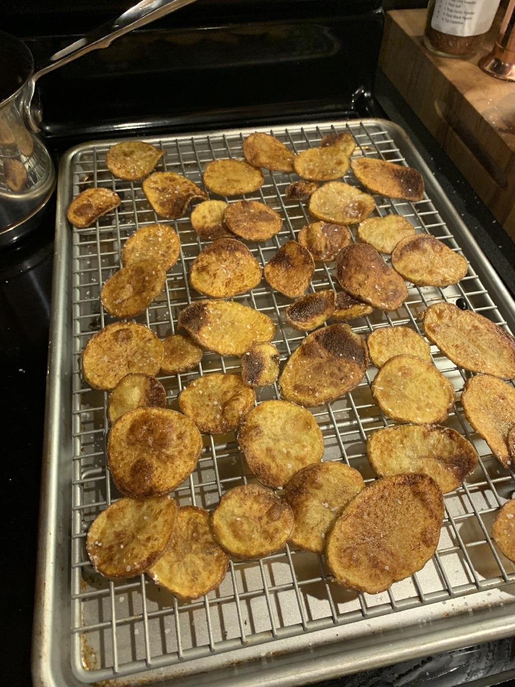 Step #6 Remove to a cooking sheet, lined with paper towels, and sprinkle with salt. Repeat until all your potato chips are fried.
