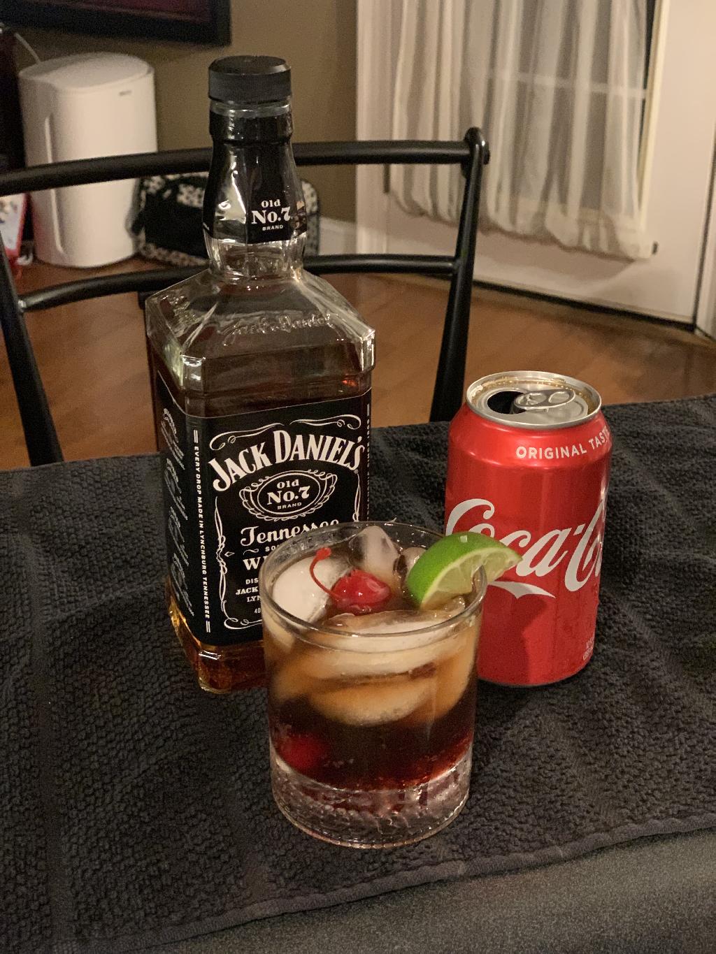 Step #1 Fill a highball glass with ice. Pour in 8 oz of Coke and 1.5 oz of Jack Daniels. Add a splash of Geraldine and a Maraschino Cherry. Take one lime wedge and rub it around the rim of the glass.
