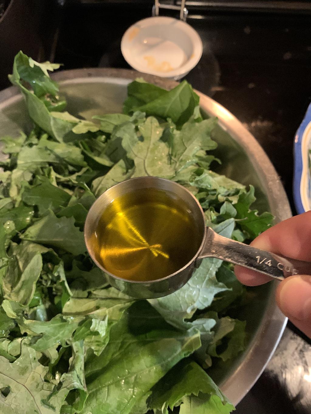 Step #3 Add kale to a large bowl and pour in Olive Oil, using hands to mix and coat the Kale in oil. Sprinkle in sea salt, mixing to coat leaves.
