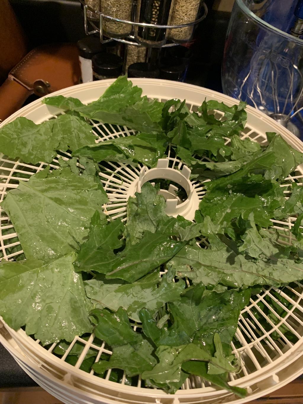 Step #4 Evenly place kale leaves on dehydrator tray. Set temperature set to 155 degrees Fahrenheit and allow to run for one hour before reducing temperature to 95 degrees Fahrenheit. Allow to run 3 to 4 more hours.