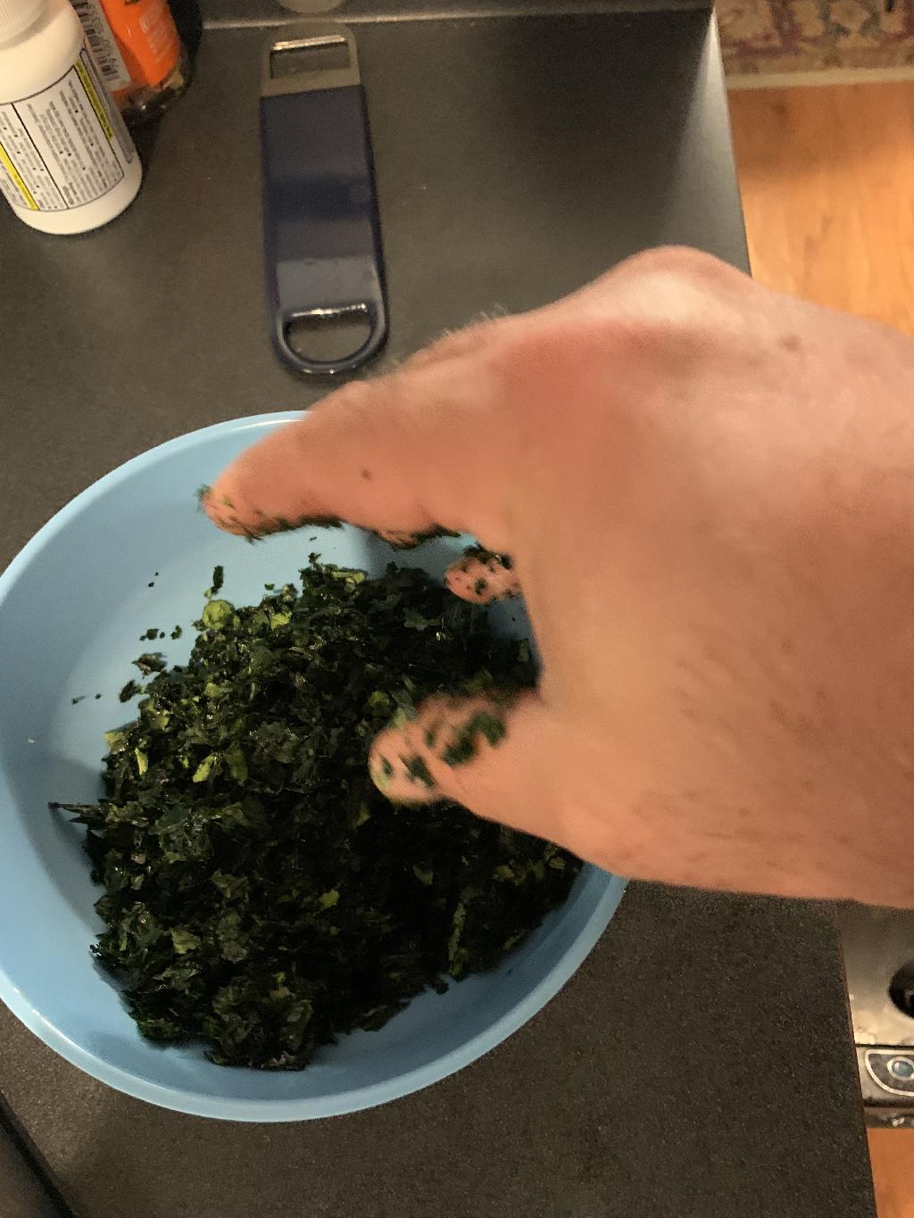 Step #5 Remove Kale to bowl, then use your hands to crush leaves into small crumbs.