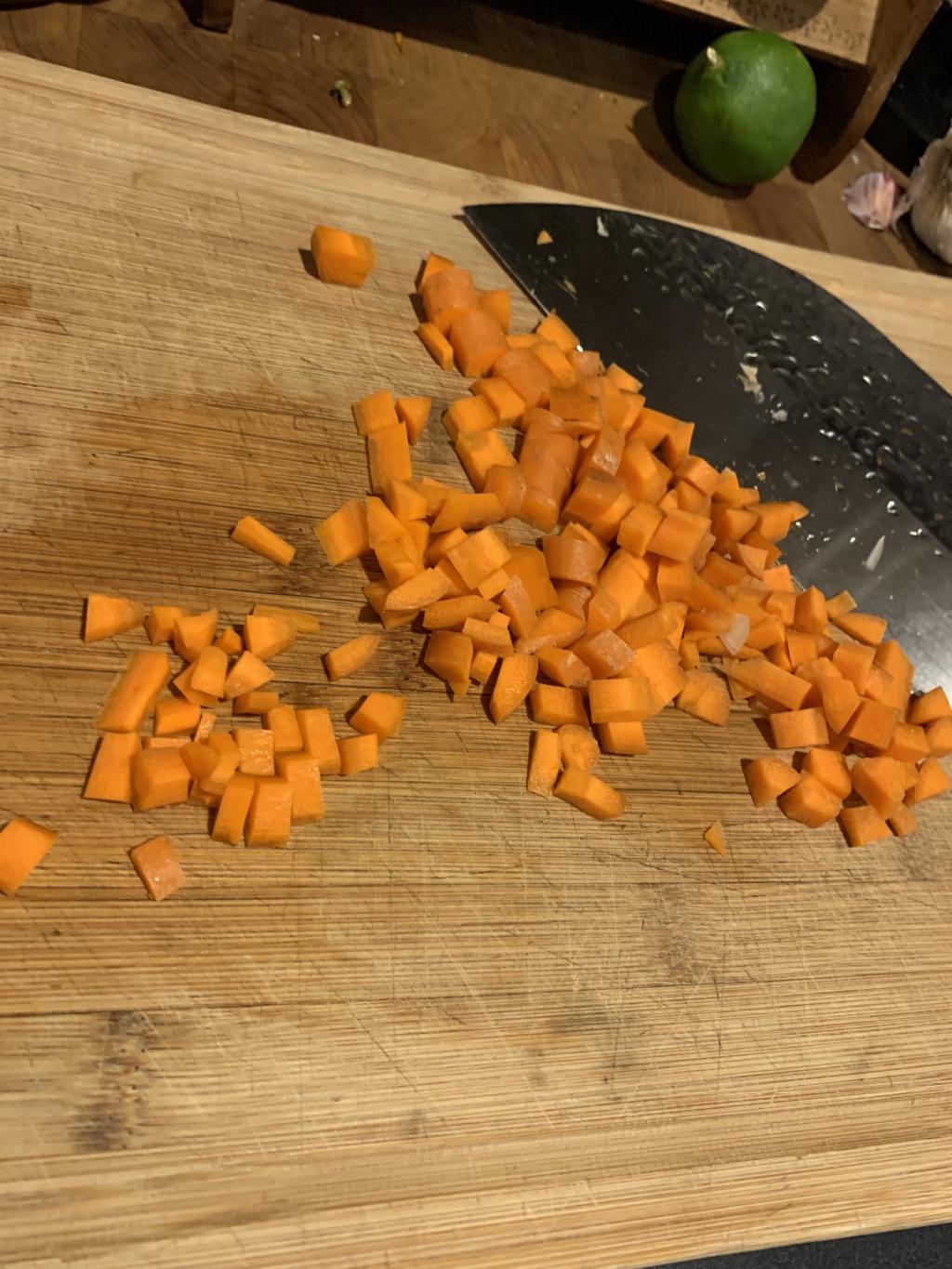 Step #1 Prepare your ingredients by washing the vegetables. Dice the onions, garlic, and carrots, then slice up the mushrooms.