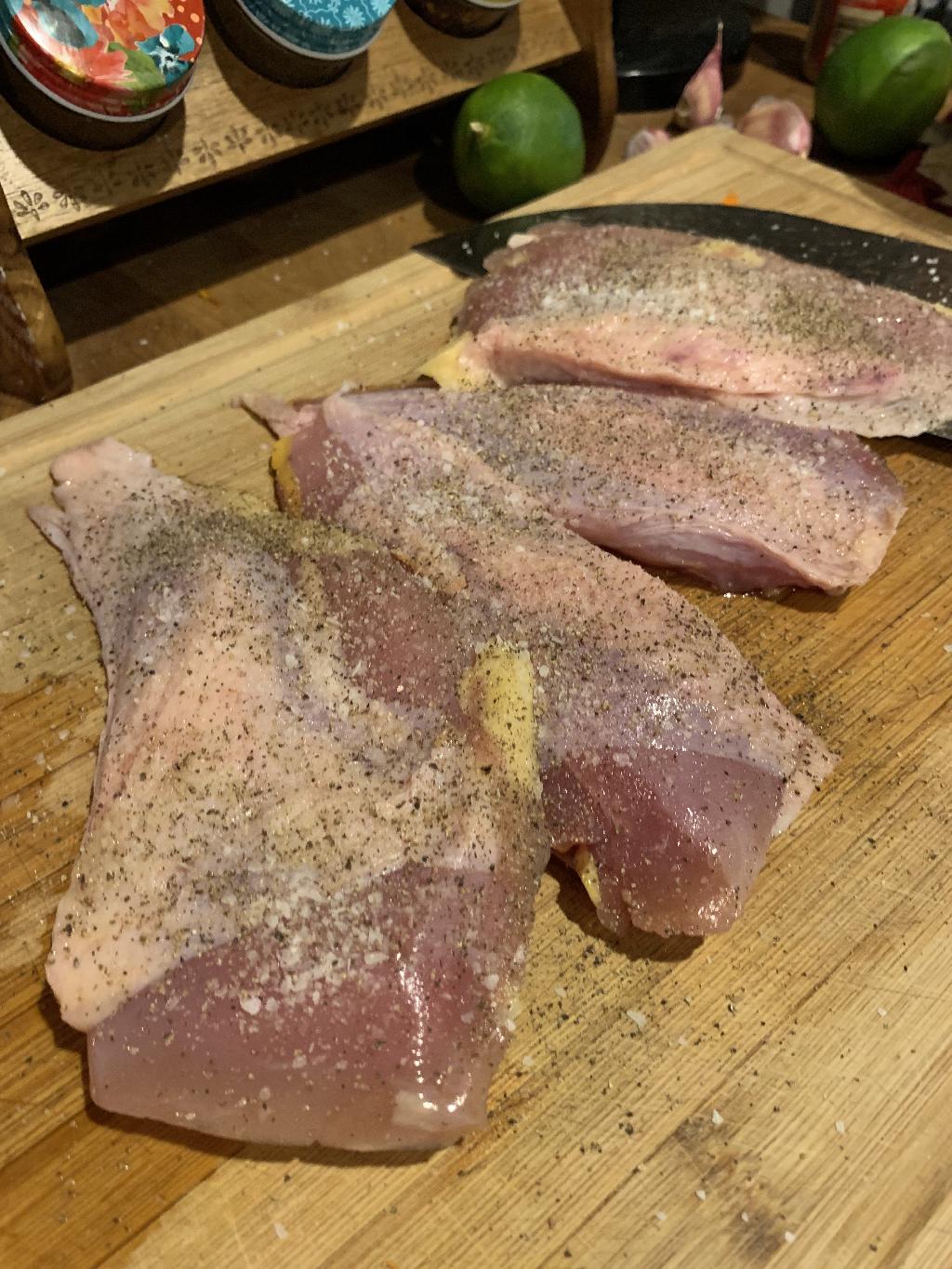 Step #3 While the skillet gets hot, season both sides of the Pheasant with Salt and Pepper.